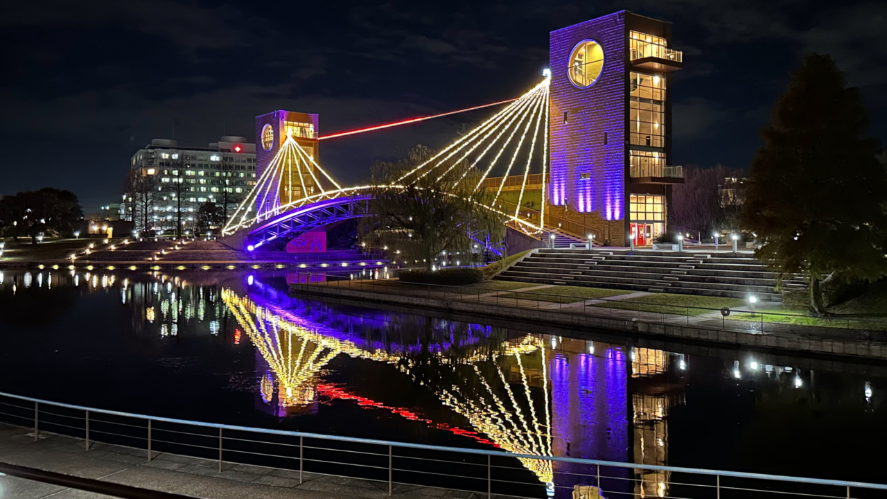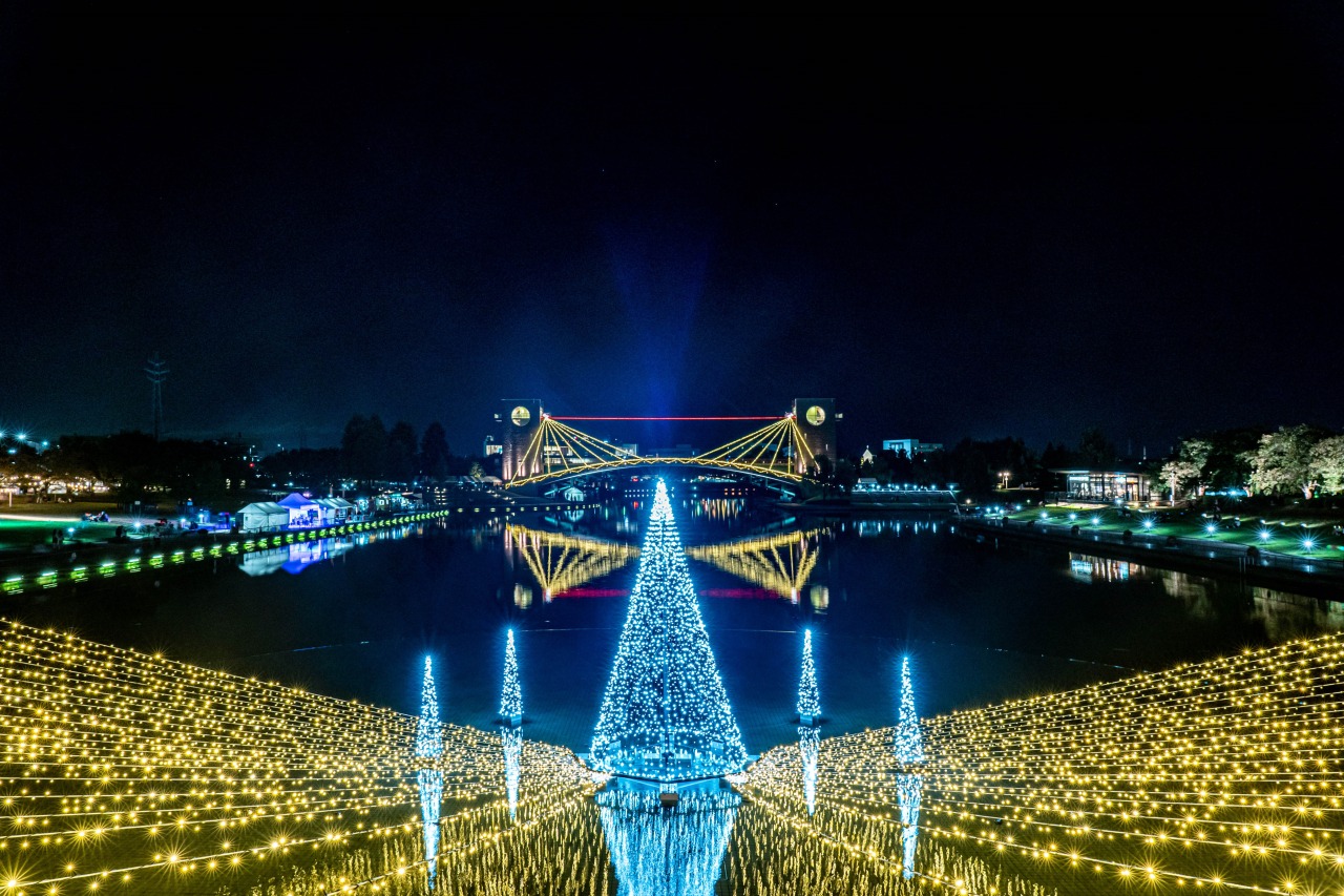 富山市の「富岩運河環水公園」にある天門橋が、5日から「環水公園クリスマスデコレーション2025」で華やかにライトアップされている。点灯は25日まで続く。