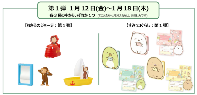 日本マクドナルドは、12月12日(金)から期間限定でハッピーセット「おさるのジョージ」と「すみっコぐらし」を全国(一部店舗除く)で販売する。