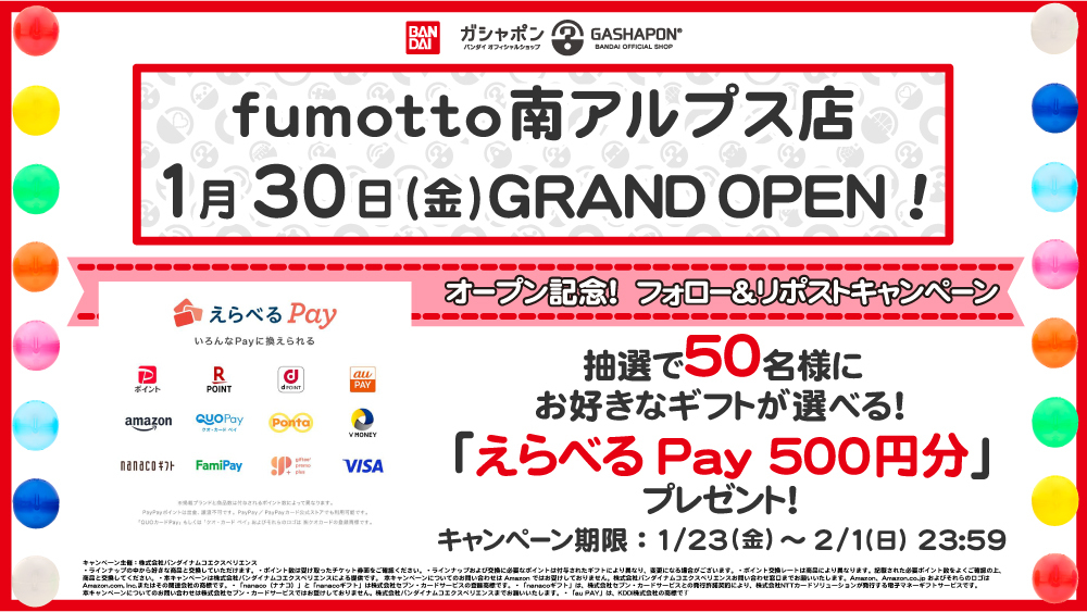 @FUJI_yama830山梨県南アルプス市に「ガシャポン」の専門店が登場 「バンダイオフィシャルショップ fumotto 南アルプス店」1月30日オープン ampmedia.jp/2026/01/24/gas… #ampreview