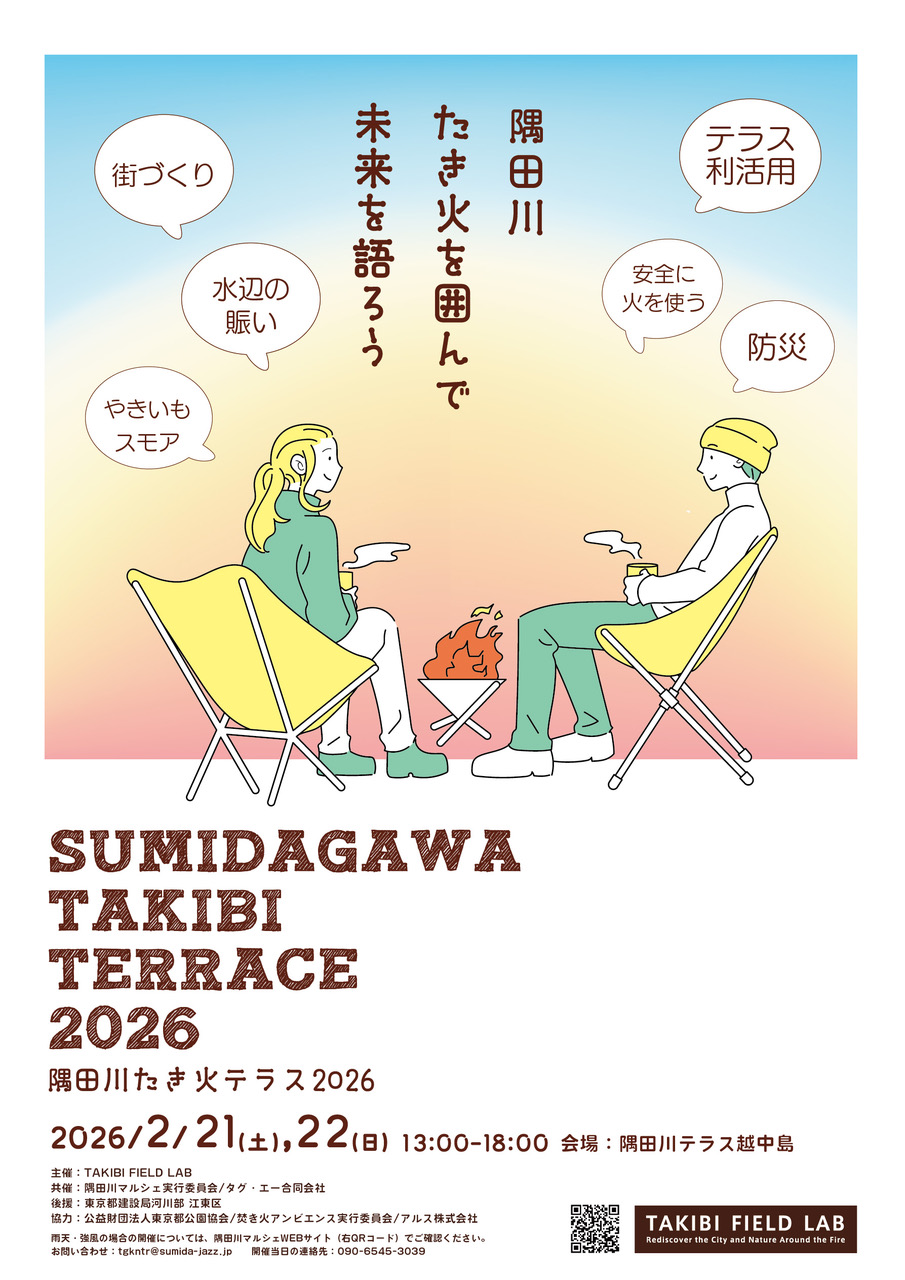 2月21日・22日、江東区越中島の「隅田川テラス」で、「SUMIDAGAWA TAKIBI TERRACE 2026」が開催される。開催時間は13時~18時。入場無料。