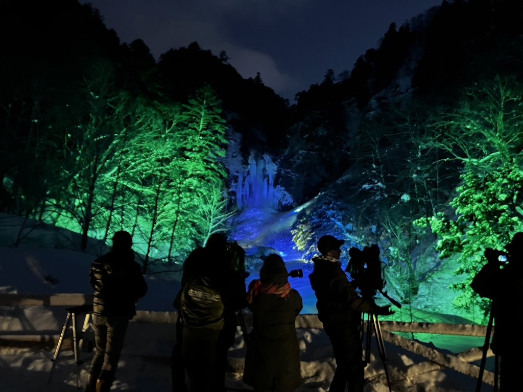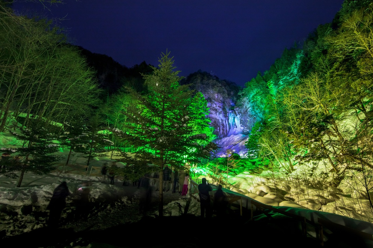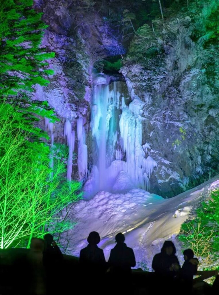 高さ64メートル・幅6メートルの滝は「日本の滝百選」にも選ばれ、冬には流れ落ちる水が巨大な氷柱へと変化。青・緑・白のライトに照らされ、幻想的な氷の景色が夜空に浮かび上がります。