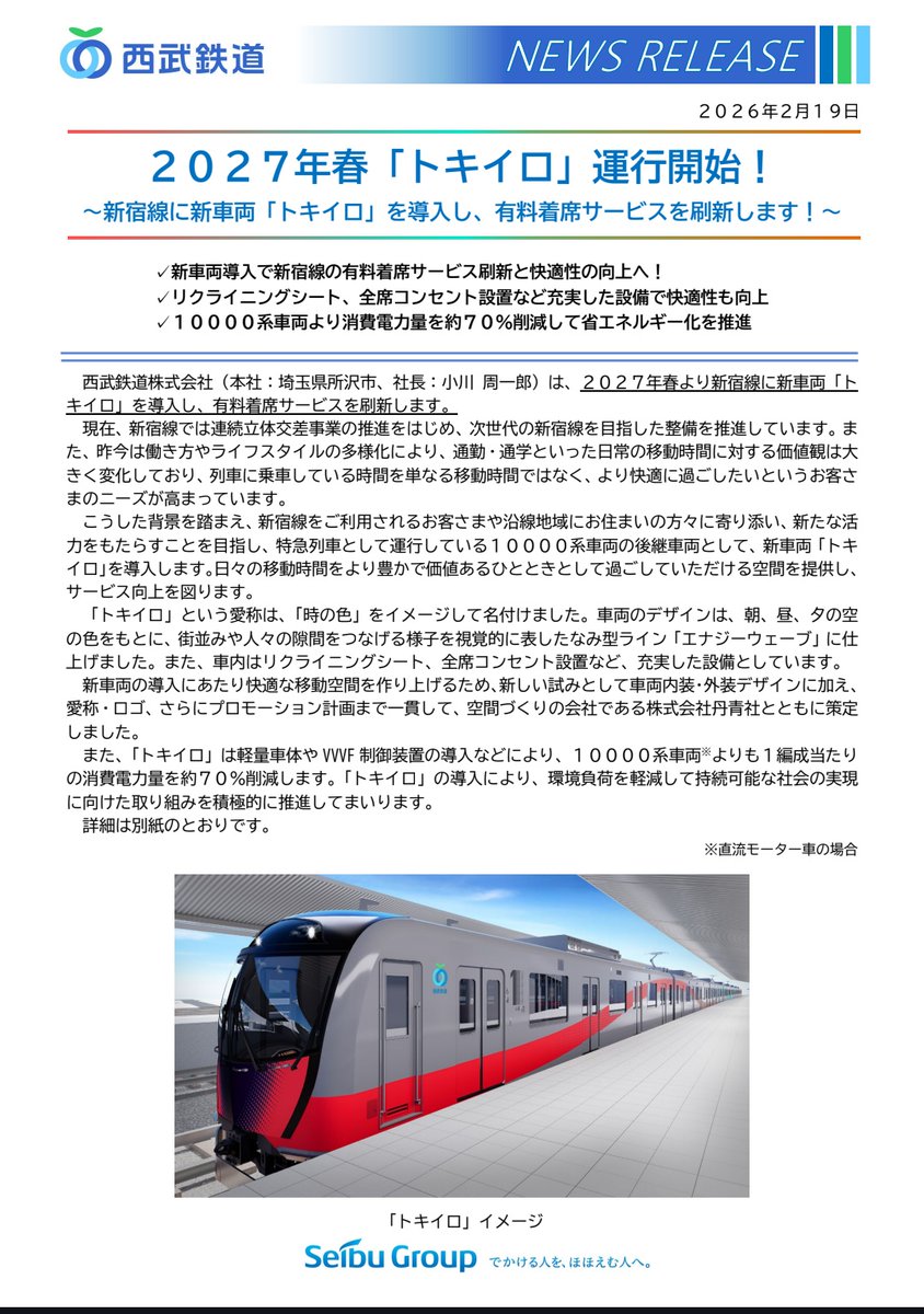 @cieloazulジョインジョイントキィ 西武新宿線に新車両「トキイロ」登場! 有料着席サービスを刷新、2027年春運行開始 tetsudo.com/news/3967/ #鉄道コム @tetsudo_comから
