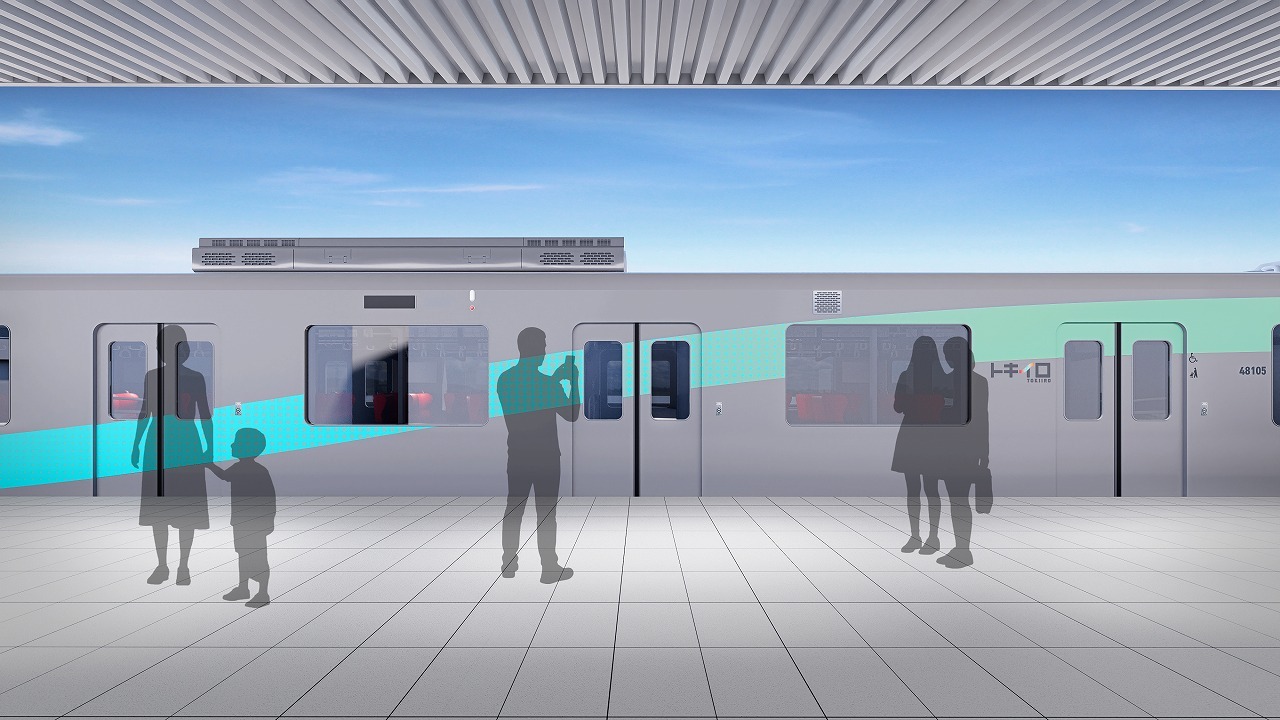 愛称の「トキイロ」は「時の色」をイメージ。ロゴには新宿線の頭文字「S」を取り入れ、滑らかな曲線で快適性を表現しています。デザインテーマは「エナジーウェーブ」で、街や人をつなぐ波のラインを採用。グラデーションやドットデザインにより、見る距離によって印象が変わる外観に仕上げられています。前面は朝焼けと夕焼けを表現したダブルフェイス仕様で、深い紫色で夜空もイメージし、時間の移ろいを表現しています。