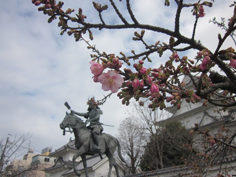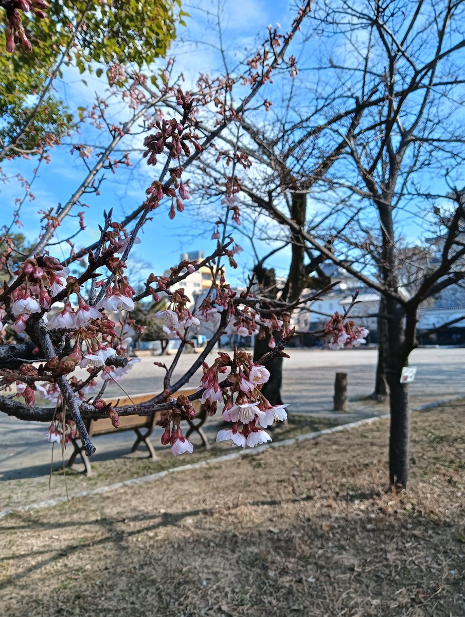 現在、公園では早咲きの桜「河津桜」が花を開き、ひと足早い春の気配を感じさせてくれています。大垣城のすぐ隣にあるため場所も分かりやすく、城と桜の組み合わせも見どころのひとつ。やわらかなピンク色の花が、とても華やかです。