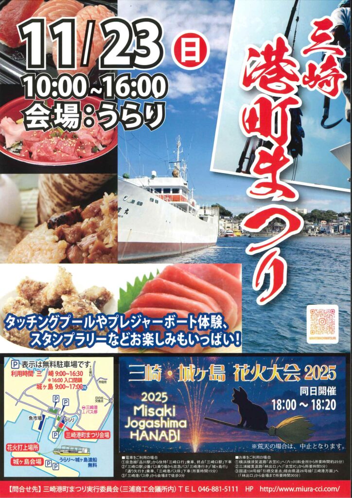 イベント・お祭り 三浦市「三崎港町まつり」花火大会も同日に開催!11/23(日) 2025年11月19日 2025年11月23日(日)、神奈川県三浦市の三崎港で「三崎港町まつり」が開催されます(10:00〜16:00)。 新鮮な魚介類や三崎まぐろ加工品の格安即売会、まぐろグルメが楽しめる飲食コーナー、家族向けのワークショップやハンドメイドマーケット、ステージ企画など内容盛りだくさんです。 さらに、城ヶ島渡船「さんしろ号」... yoshikatsu