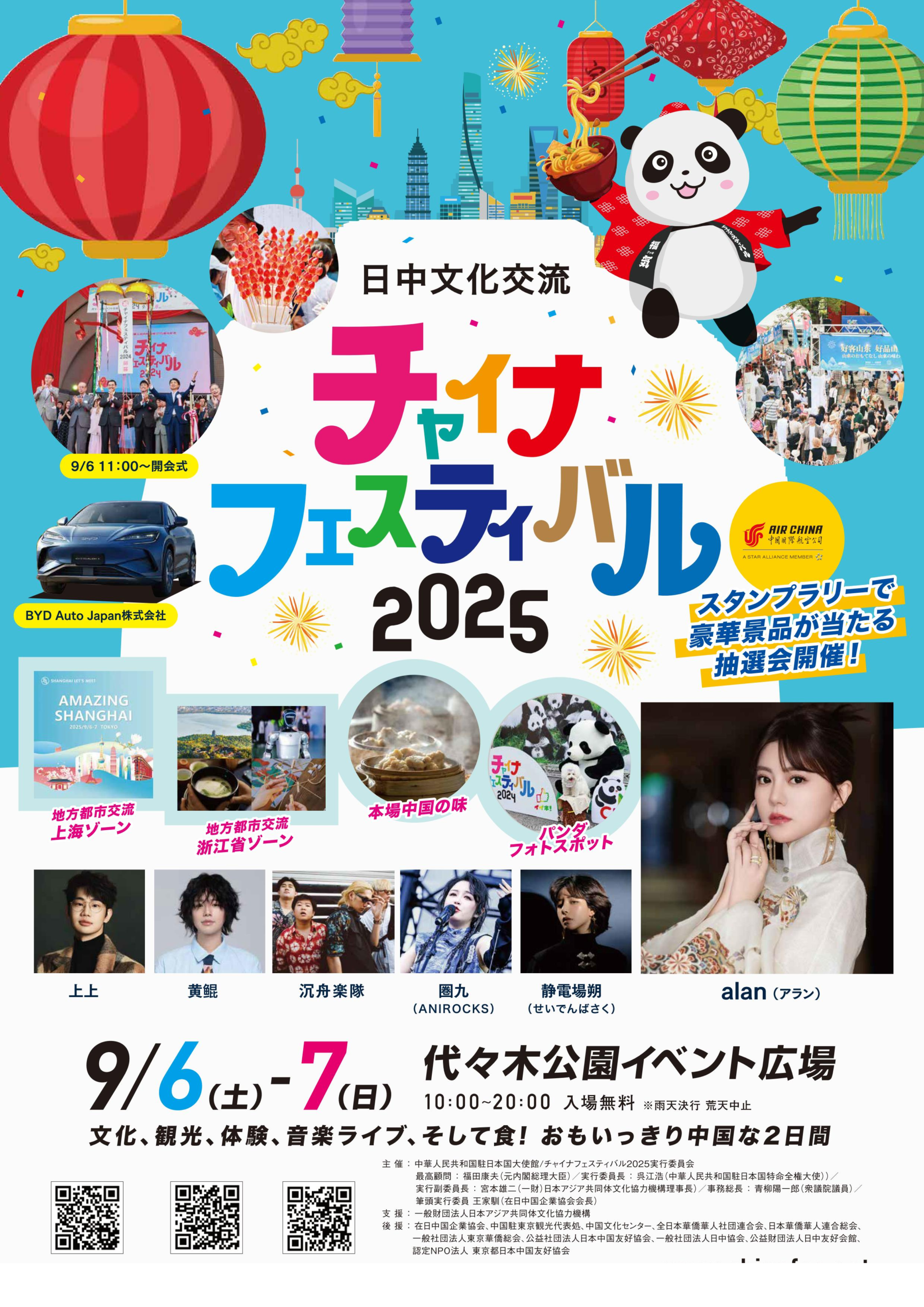 日中文化交流の祭典「チャイナフェスティバル」が9月6日・7日、代々木公園イベント広場で開催されます。このフェスは2017年に日中国交正常化45周年を記念して始まり、芸能・食・観光・パフォーマンスを通じた交流を目的に開催されてきました。昨年は約18万人が来場し、今年は20万人を見込んでいます。今年のテーマは「中国の『いま!』を知る・伝える」との事。