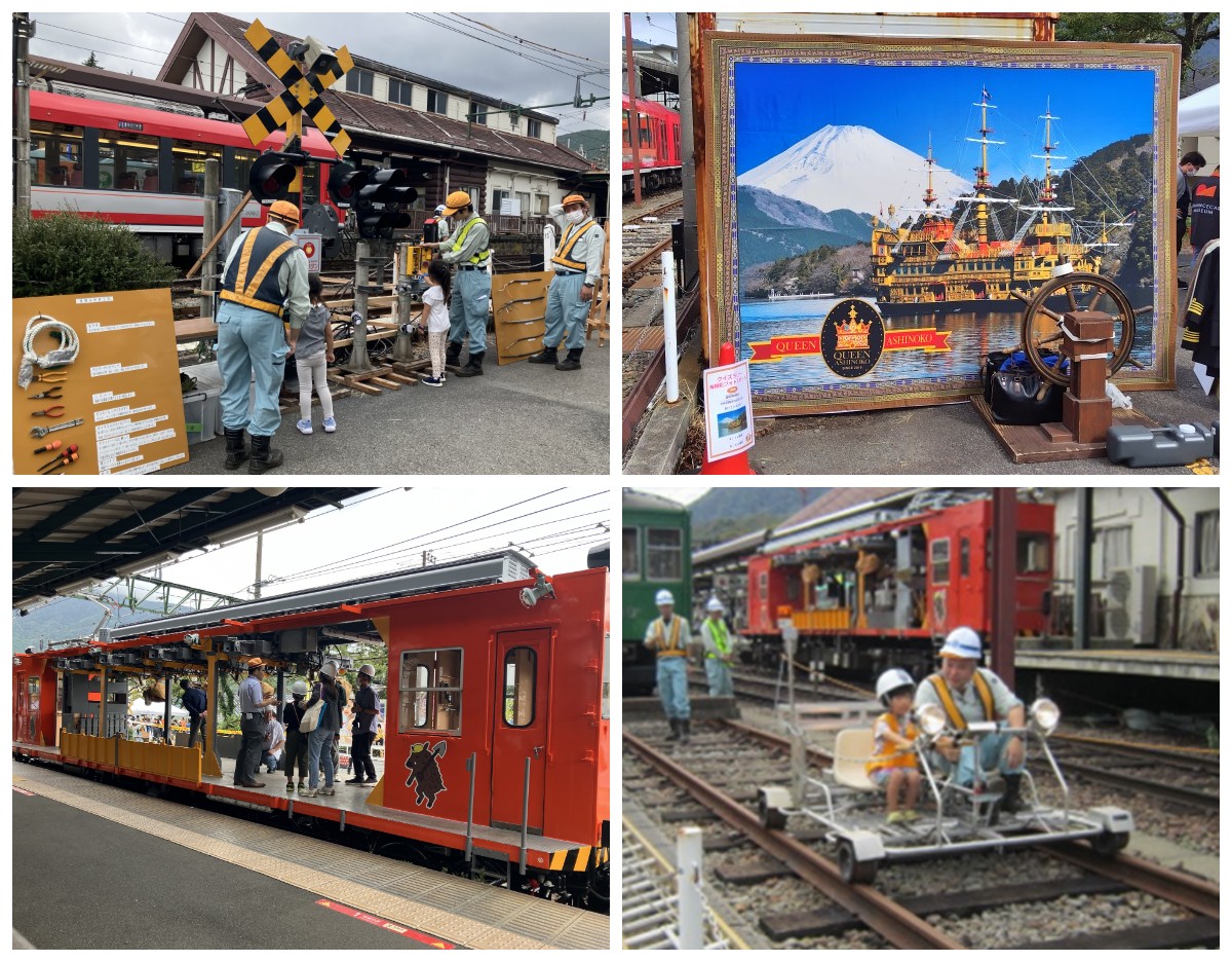 強羅会場では、運転士・車掌なりきり体験、線路保守用ATカート乗車、貨物車両見学、ガチャ企画、展示やフォトスポットなどを楽しめます。さらに駅前マルシェやじゃんけん大会など地域一体のイベントも展開。