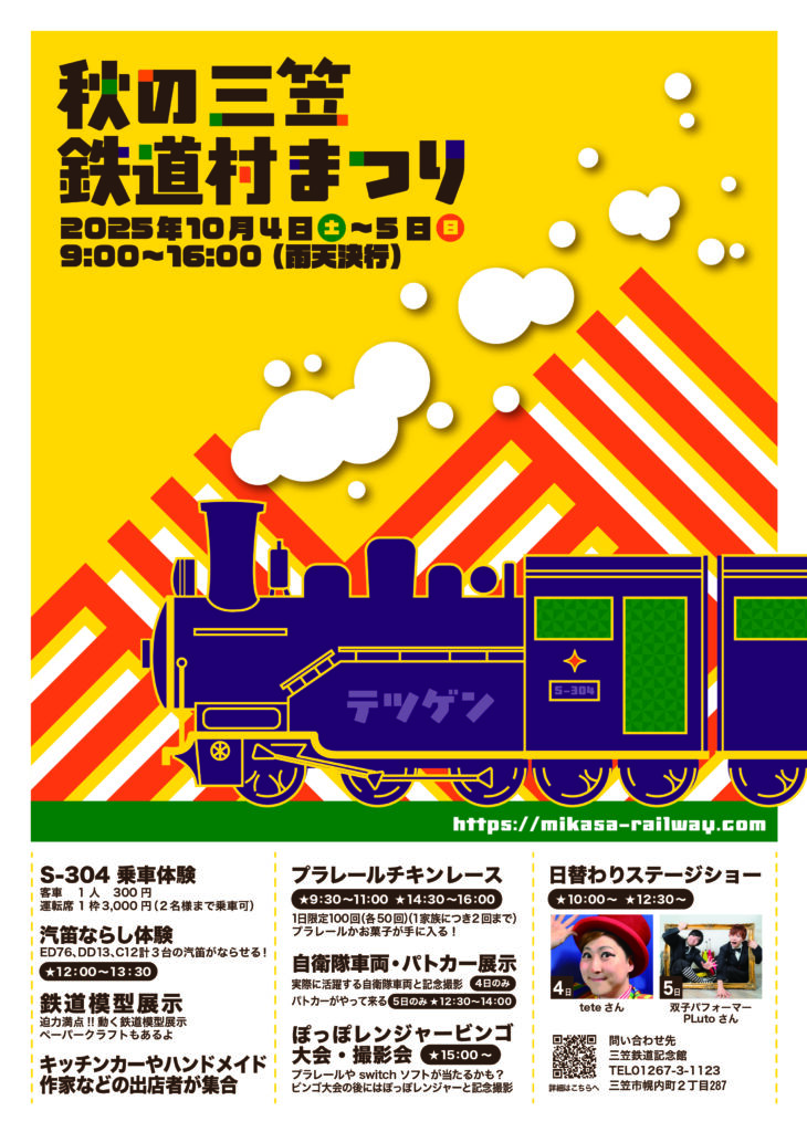 イベント・お祭り 北海道、三笠鉄道記念館「秋の三笠鉄道村まつり」10/4~開催! 2025年9月29日 2025年9月29日 yoshikatsu Facebook postはてブLINEPocketFeedly 「秋の三笠鉄道村まつり」が2025年10月4日・5日に開催されます!地域の魅力を存分に楽しめるこのイベントは、家族連れや鉄道ファンにとっての夢のようなひととき。美しい秋の風景を背景に、特別展示や様々なアトラクションが用意されています。この機会にぜひ訪れて、鉄道の魅力を再発見しましょう! 目次1 <関連する記事>2 <関連する画像> <関連する記事> 10月4日・5日 「秋の三笠鉄道村まつり」開催|鉄道イベント|2025年9月23日掲載|鉄道ファン・railf.jp - 鉄道ファン・railf.jp (出典:鉄道ファン・railf.jp) 秋の三笠鉄道村まつり<2025> - domingo.ne.jp (出典:domingo.ne.jp) <関連する画像> (出典 mikasa-railway.com) (出典 sorachi-de-view.com) ピックアップ記事 Facebook postはてブLINEPocketFeedly