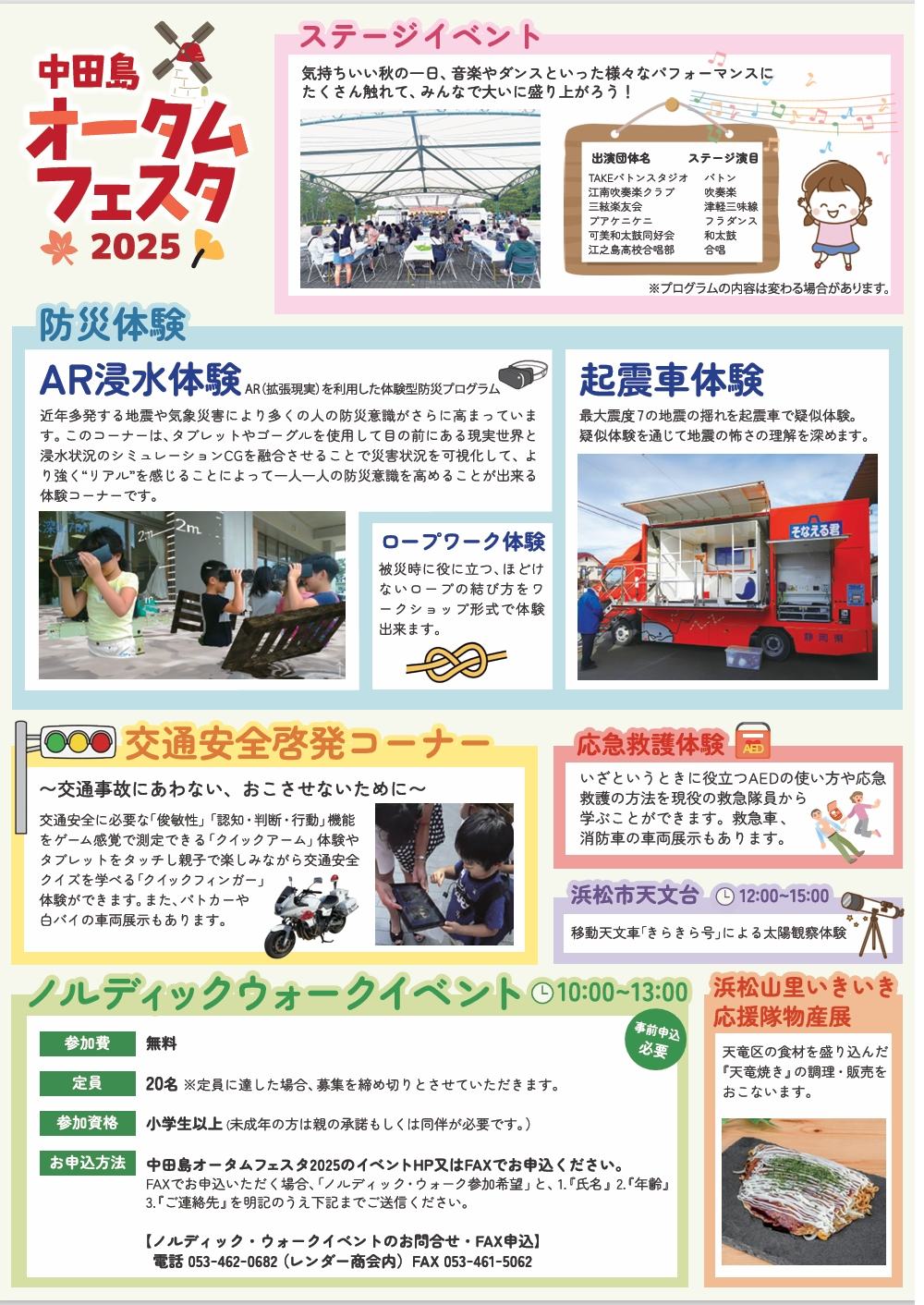 「中田島オータムフェスタ2025」は、10月4日に静岡県浜松市の「遠州灘海浜公園」で開催されます。イベントでは、防災体験として震度7の揺れを体感できる起震車やARによる災害シミュレーションが用意され、応急救護や交通安全体験も実施。さらに、移動天文車「きらきら号」による太陽観察会、ロープワーク、ノルディック・ウォーク、ふわふわ遊具など多彩な体験が楽しめます。