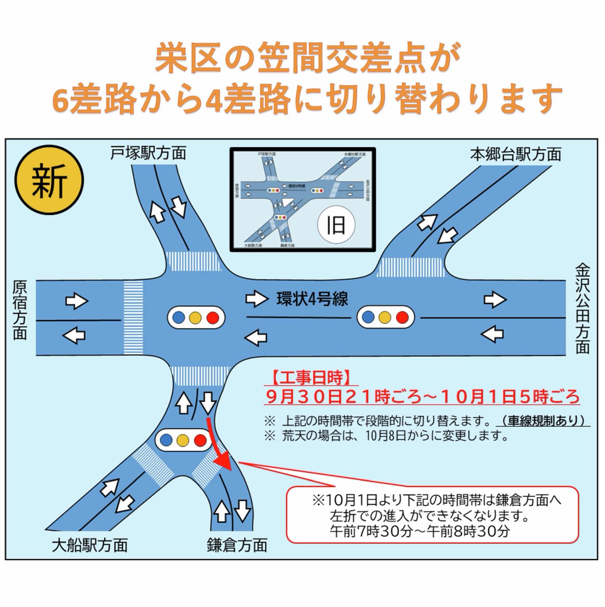 今回の工事では、6差路を十字路1カ所と丁字路2カ所に分け、角度を直角に近づけることで見通しを改善。道路拡幅も行い、事故防止と渋滞緩和を目指す。工事は横浜環状南線建設に伴う周辺整備の一環として実施された。