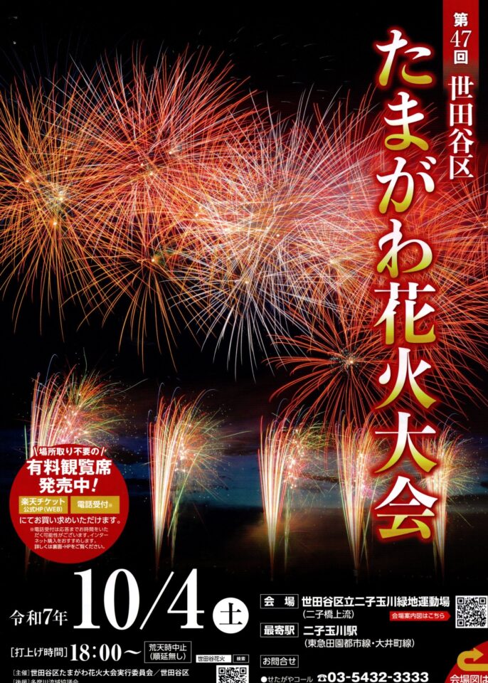 10月4日(土)、第47回「世田谷区たまがわ花火大会」が開催されます。多摩川対岸の川崎市で同時開催される「川崎市制記念多摩川花火大会」とあわせて「ニコタマ花火大会」として親しまれている人気イベントです。両岸でそれぞれ6,000発、合計約12,000発の花火が秋の夜空を彩り、迫力ある光景が楽しめます。両大会とも長い歴史を持つ恒例行事で、コラボ開催により2倍の華やかさと迫力を演出します。