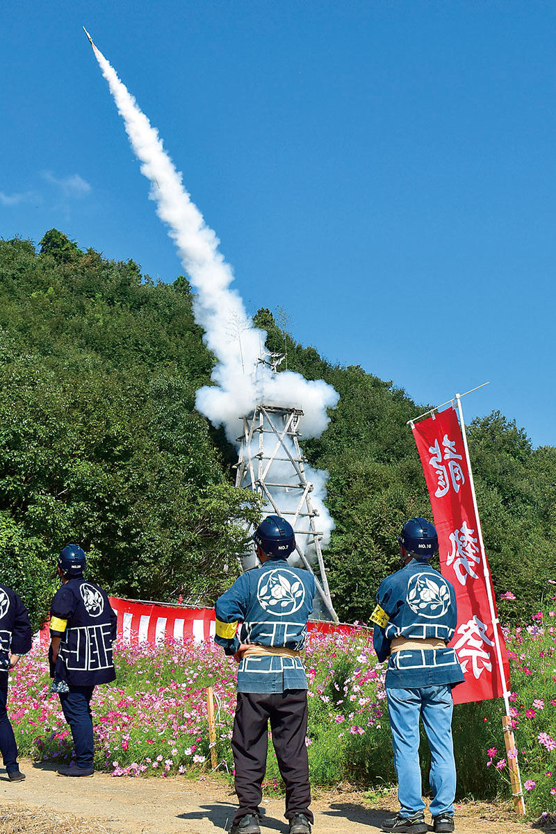 2018年に国の重要無形民俗文化財に指定された「秩父吉田の龍勢」。手作りロケットが秋空へ高く打ち上げられる迫力満点の伝統行事。白煙を噴いて打ち上がる様子が龍の昇天する姿に似ていることからそう呼ばれている。