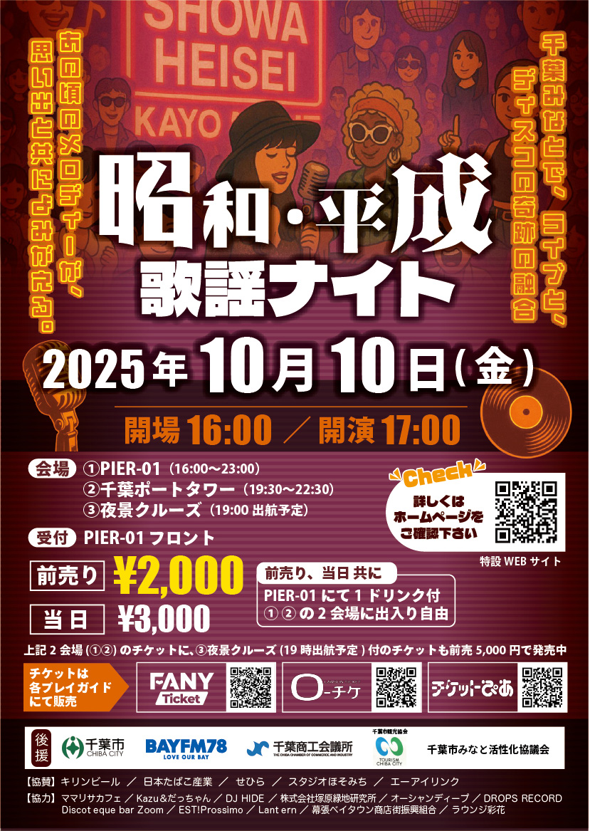 レストラン「PIER-01」(ピアゼロワン)では歌謡ライブやDJイベントが行われ、レコード販売や千葉ポートタワー展望フロアでのディスコ開催、夜景を楽しむ「工場夜景クルーズ」など多彩な企画が展開される。屋外にはキッチンカーや屋台も並び、ライブ映像を映すスクリーンも設置。主催者は「非日常を味わいながら昭和・平成の時代を懐かしんでほしい」としている。熱く楽しい夜になりそうですね!