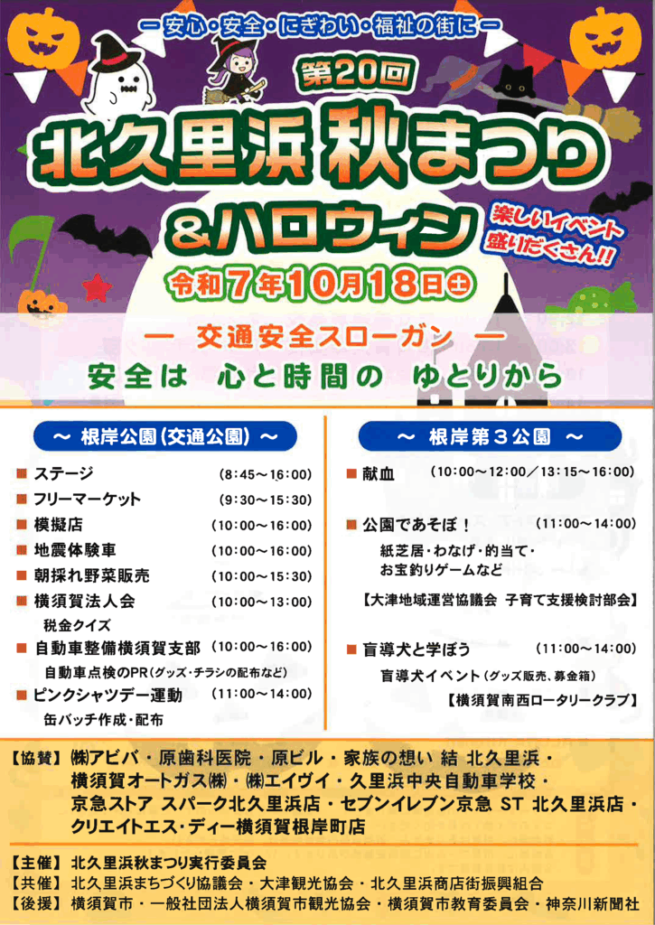「北久里浜秋まつり&ハロウィン」は、2025年10月18日(土)に根岸公園(交通公園)と根岸第3公園で開催される記念すべき第20回のイベントです。
