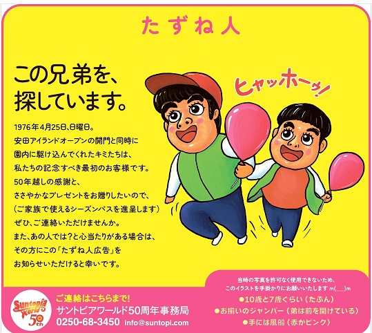 新潟県の遊園地「サントピアワールド」が新聞に掲載した“たずね人”広告が話題となっている。同園は2026年に開園50周年を迎えるにあたり、前身「安田アイランド」として開園した1976年4月25日に最初に入園した人物を探している。