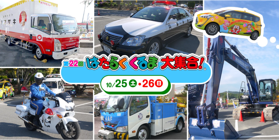 10月25日・26日、兵庫県加東市の「東条湖おもちゃ王国」で、人気イベント「はたらくくるま大集合!」が開催されます。約40台の白バイ・パトカー・工事車両・キッチンカーなど多彩な「はたらく車」が集結し、見学や記念撮影を楽しめるイベントです。参加無料(駐車料金・入園料別)。展示にはダンプカー、パワーショベル、ミキサー車、EVバス、キャンピングカー、デロリアンなども登場。白バイ・パトカーは15時まで、ウニモグや移動博物館車「ゆめはく」は25日のみ展示します。
