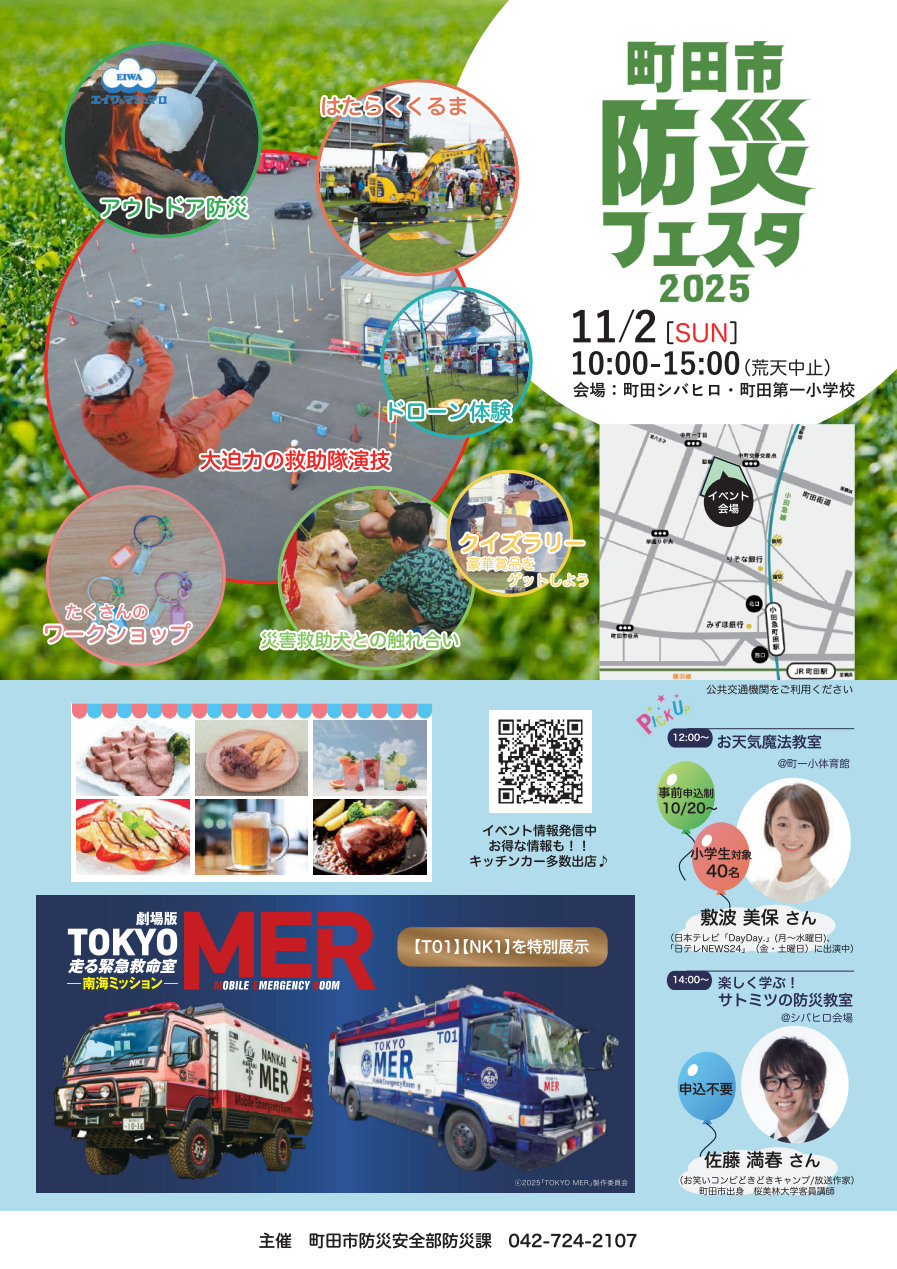 「町田市防災フェスタ2025」は、幅広い世代に防災意識を高めてもらうための“楽しく学べる”体験型イベントとして開催されます。今回は過去最大規模「町田シバヒロ」と、隣接する「町田第一小学校」の2会場で実施。町田シバヒロに19ブース、町田一小に21ブースを設け、2会場で計40ブースが登場します。