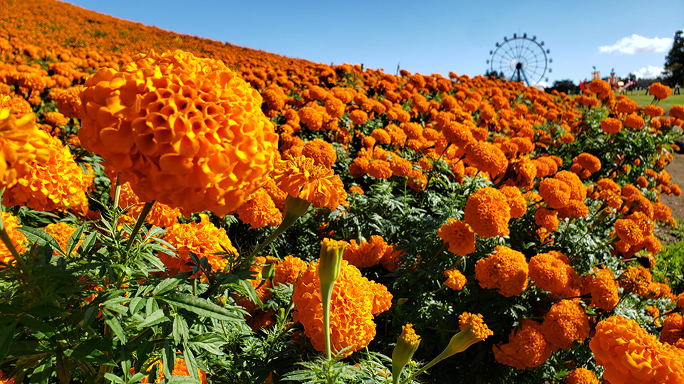 新たに花畑「いろどりの丘」の農地を拡張し、昨年の2倍規模・日本一の株数を誇るオレンジと黄色の花畑が出現。大輪の「パーフェクション」品種が一面に咲き誇る。