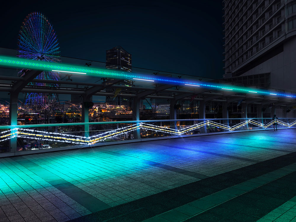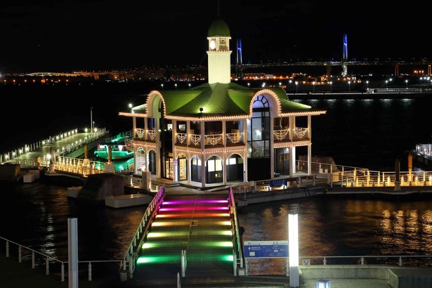 クイーンモール橋から国立大ホール横大階段、ぷかりさん橋までのルートが光に包まれ、光と海と夜景の幻想的な共演が楽しめます。