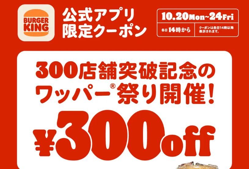 バーガーキングが全国で300店舗を突破した事を記念して、10月20日~24日の5日間「ワッパー祭り」を開催します。期間中は午後2時以降に使える300円引きクーポンを公式アプリで配布。対象は「ワッパーチーズ」や「ダブルワッパーチーズ」など5種類のセットで、店内飲食はもちろん、テイクアウトでも利用可能との事です。わたしも、さっそくこの機会を利用してワッパーを堪能したいと思います!