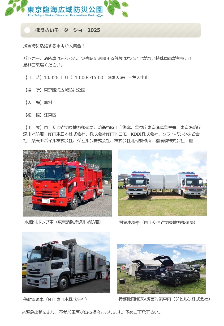 @FDyokohama119_210/26(日)「ぼうさいモーターショー2025」開催!災害時に活躍する車両が大集合!東京臨海広域防災公園 |公園へ行こう! share.google/4NyeoFLmRDqyGA…