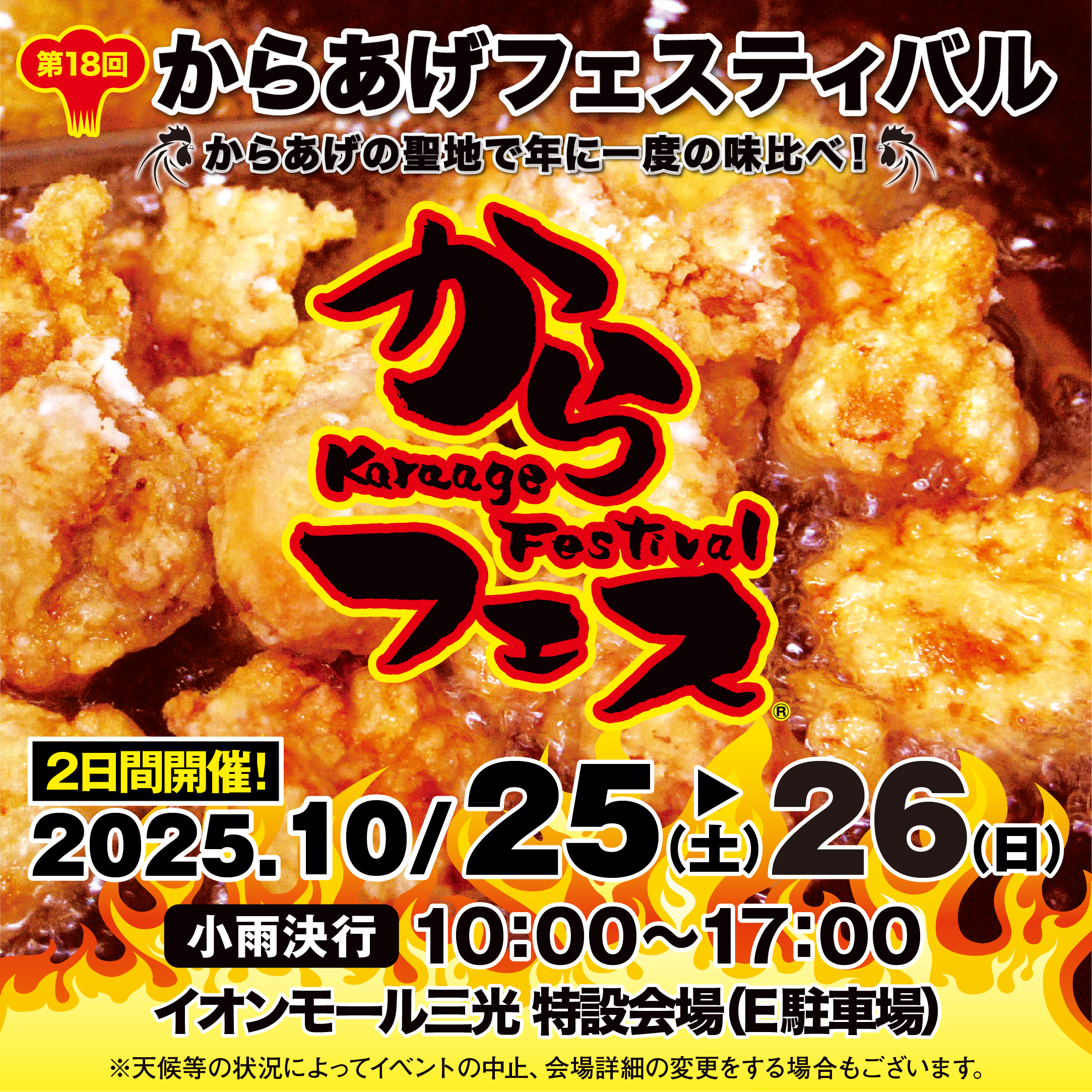 大分県中津市で「第18回からあげフェスティバル」が10月25日・26日に「イオンモール三光」特設会場で開催されるぞ!「唐揚げの聖地」中津に、全国の人気店22店舗が集結する。「からあげグランプリ」受賞店も多数出店。様々な店舗の、しょうゆ・塩味・骨付き・軟骨・手羽先など多彩な唐揚げを食べ比べできる絶好のチャンスです!