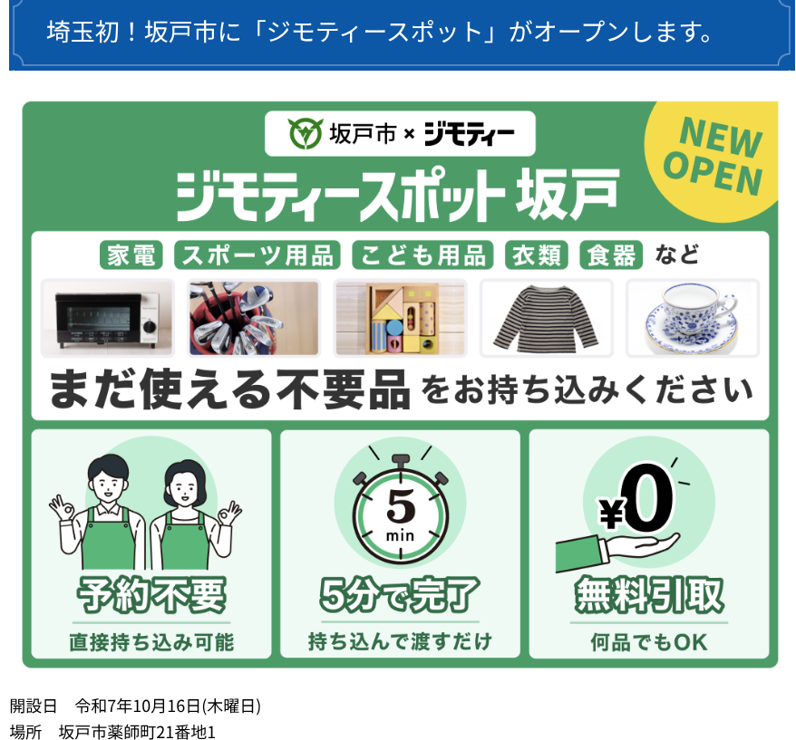 地域密着型掲示板サイト「ジモティー」が、埼玉県坂戸市に県内初の官民連携型リユース店「ジモティースポット坂戸店」をオープンした。