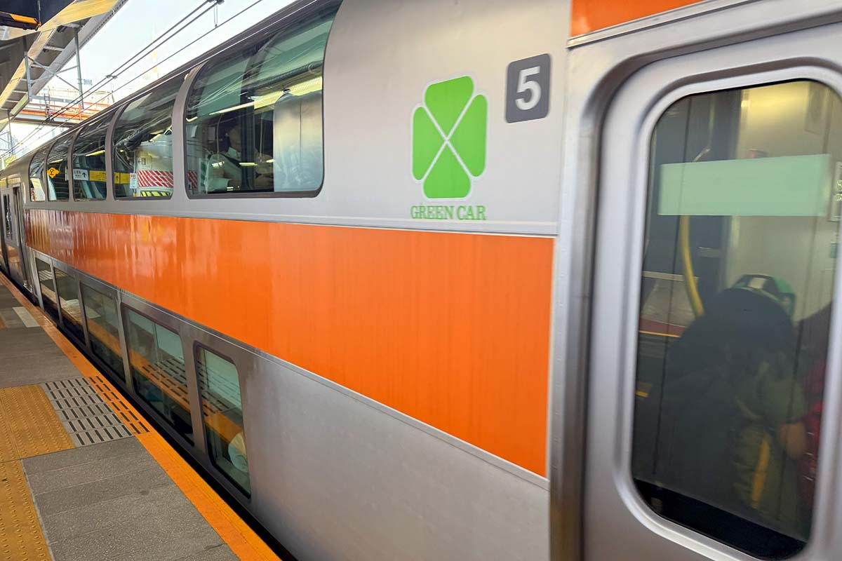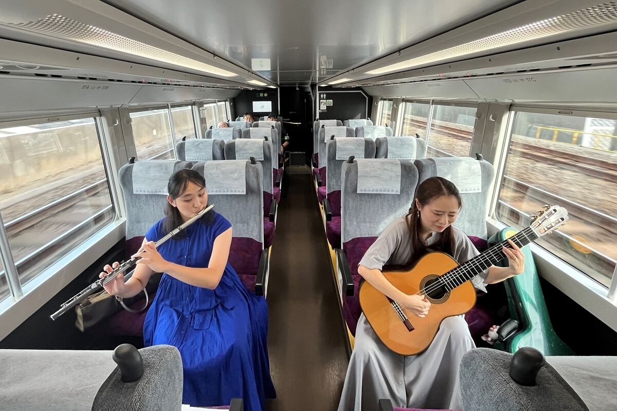 演奏はグリーン車5号車の1階席で、プロ演奏者2名によるクラリネット&マンドリン、フルート&ハープなど日替わりの組み合わせ。予約不要で「普通列車グリーン券」で鑑賞可能だ。※演奏を聞かない方は、4号車へどうぞ。