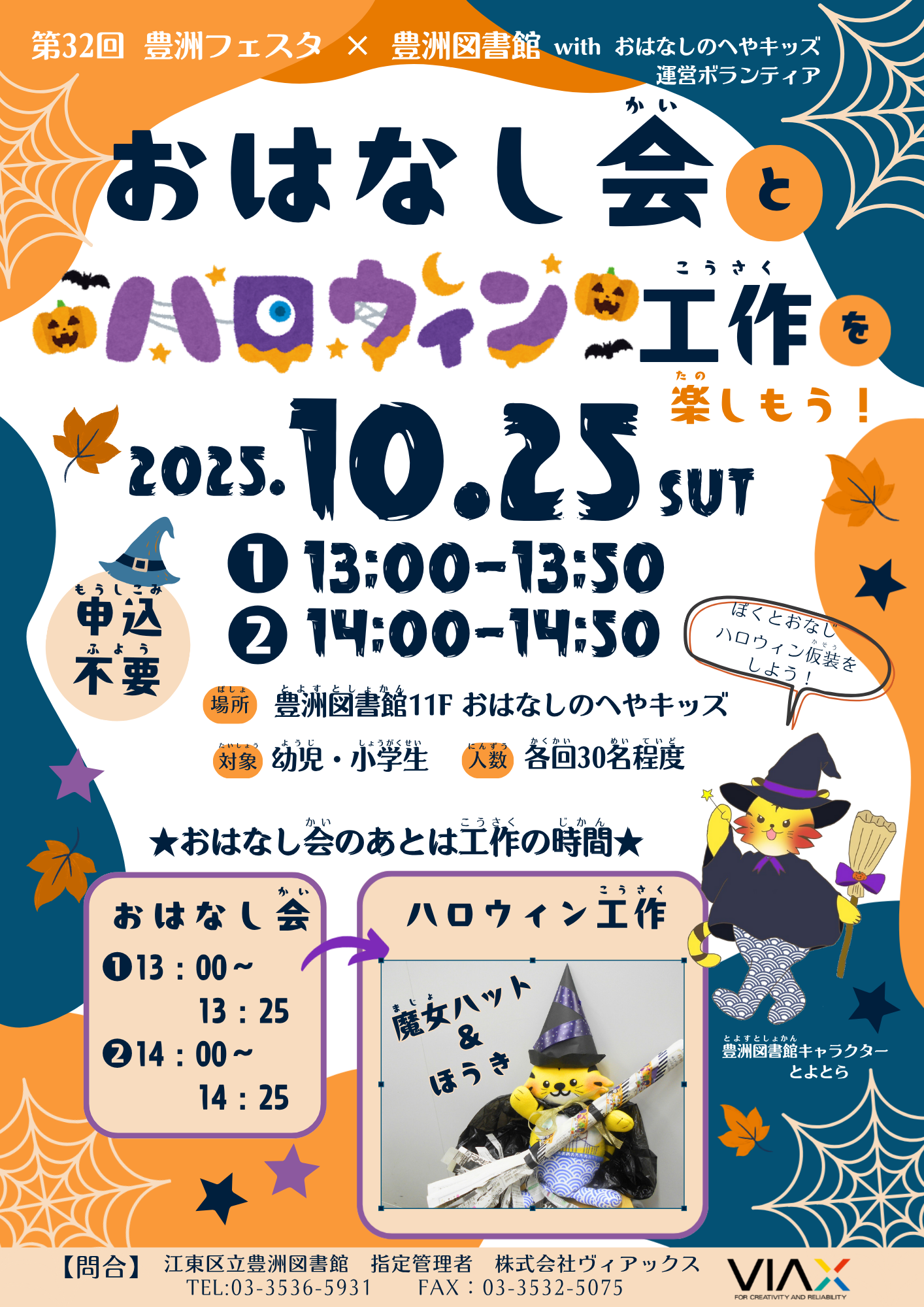 @kotolib_toyosu10月25日(土)第32回豊洲フェスタに豊洲図書館では「おはなし会とハロウィン工作を楽しもう!」を開催します。楽しいおはなし会の後、ハロウィン工作【魔女ハットとほうき】を作るよ♪申込不要です。当日に11階おはなしのへやキッズへきてね! #江東区立図書館 #豊洲図書館 pic.x.com/ybcw978hdC