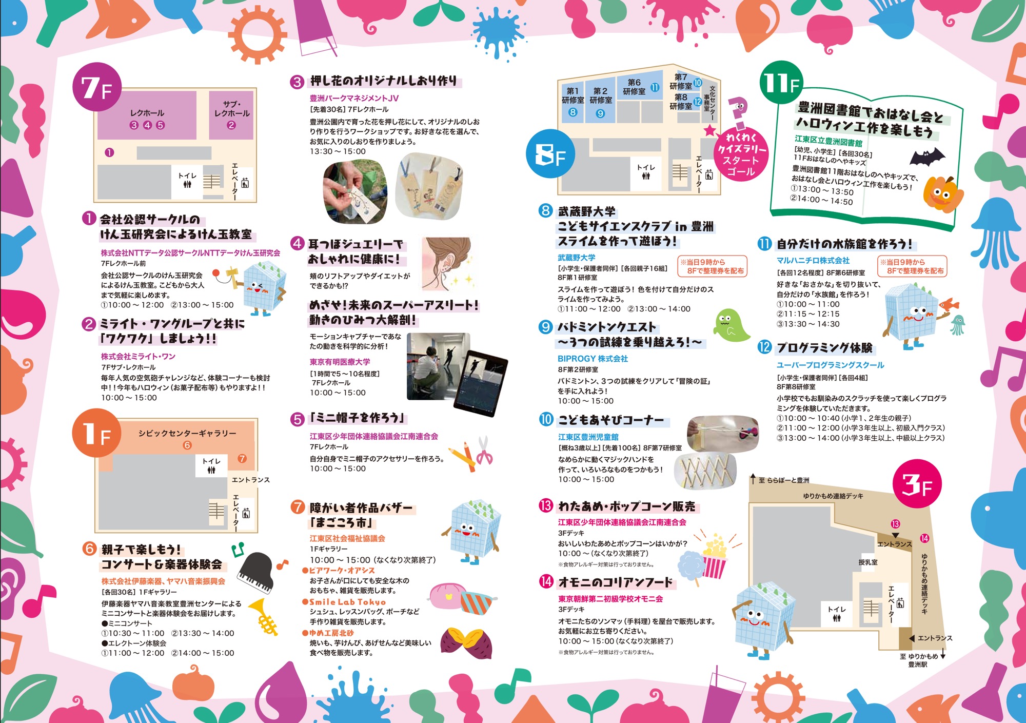会場は1階から11階までの各フロアを使って展開され、来場者が一日中楽しめる内容になっています。同日には「豊洲ハロウィン」、翌日には「親とKidsのクラシックコンサート」も開催予定です。