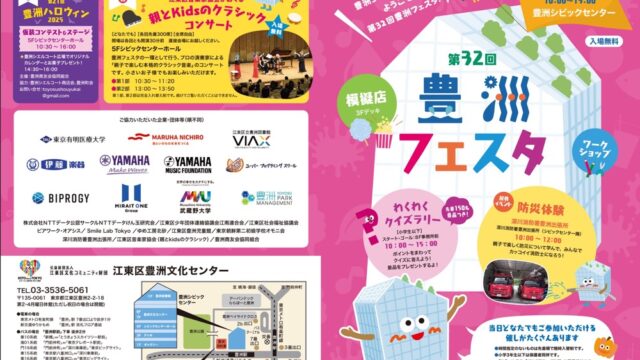 10月25日(土)、東京の「豊洲シビックセンター」で「第32回 豊洲フェスタ」が開催されます。わたあめ・ポップコーン・韓国料理などのフード屋台、音楽コンサート、ワークショップなど、地元企業やサークル団体による企画が多数行われる地域のお祭りイベントです!