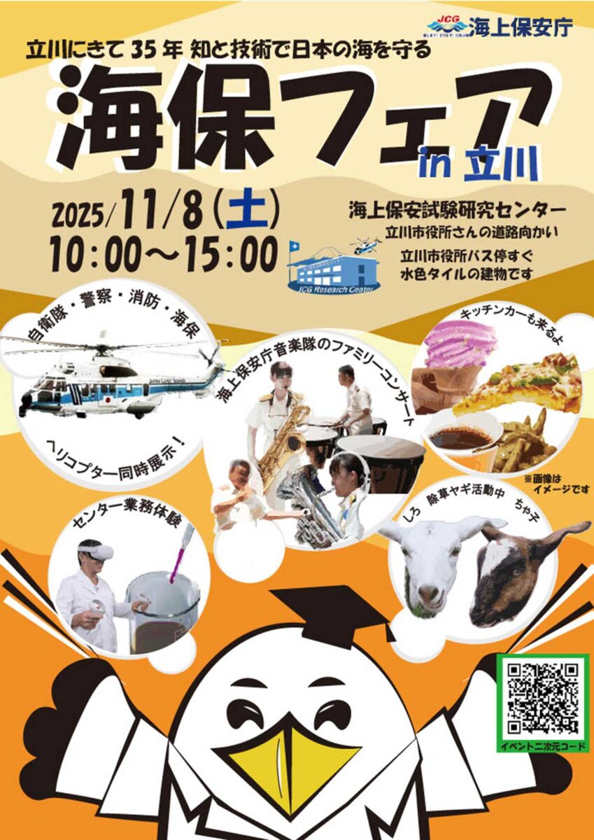 海上保安庁は、2025年11月8日(土)10時~15時に「海上保安試験研究センター」(東京都立川市)で「海保フェア2025 in 立川」を開催します。