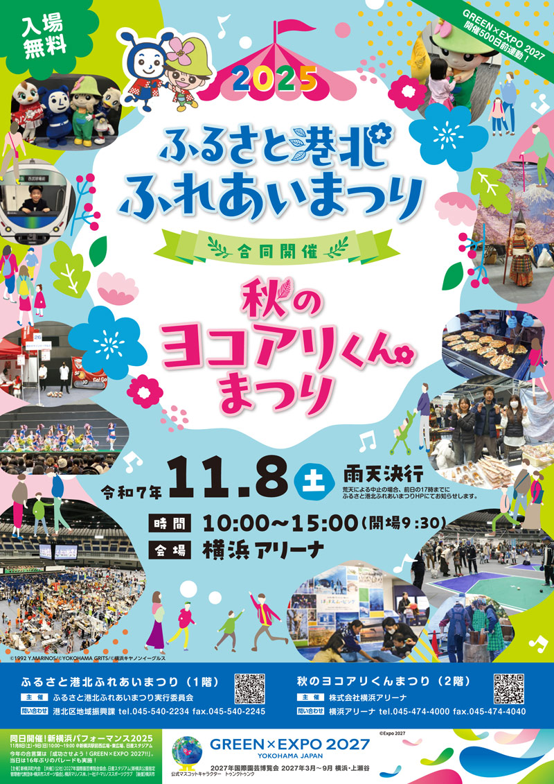 横浜アリーナでは 「ふるさと港北ふれあいまつり」(約90ブース)と 「秋のヨコアリくんまつり」(約40ブース)が同時開催され、飲食・販売・相談・体験・展示など多彩な内容が楽しめます。