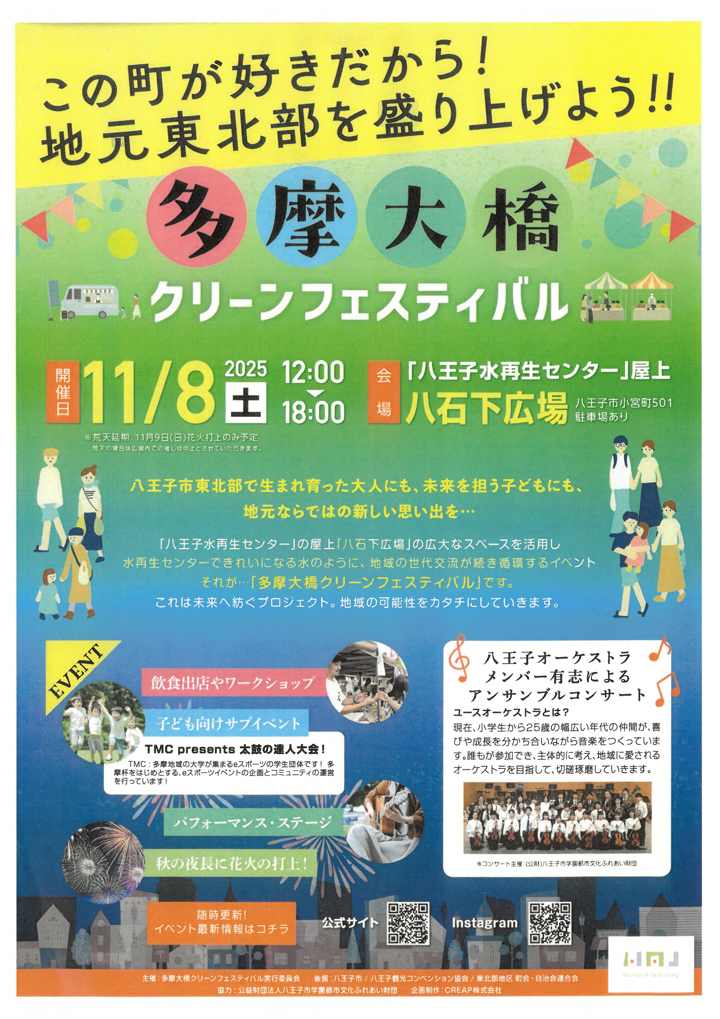 2025年11月8日(土)、八王子東北部の「八王子水再生センター」の屋上「八石下広場」で、新しい地域祭り「多摩大橋クリーンフェスティバル」が開催されます。