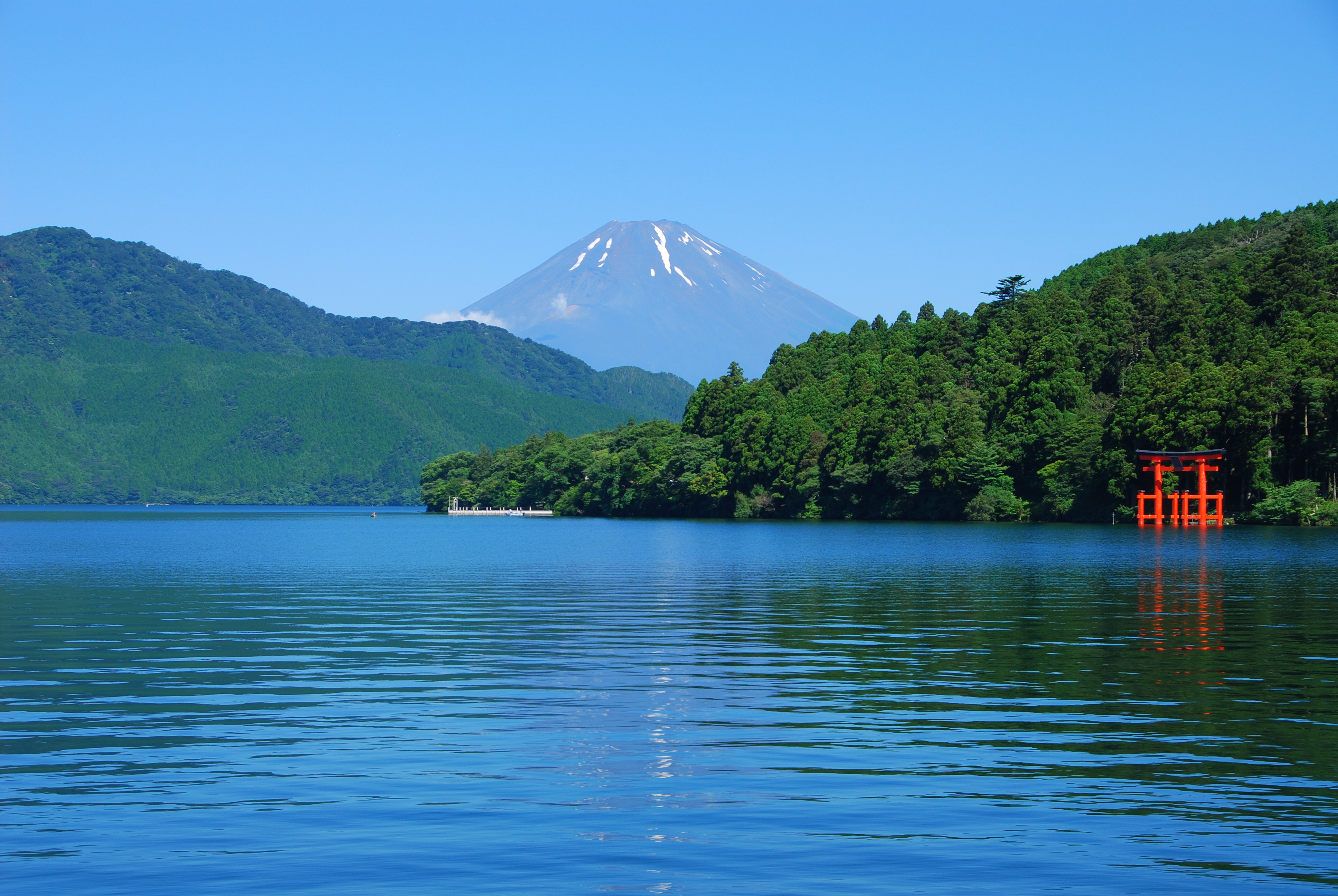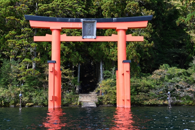 芦ノ湖の湖畔に立つ象徴的な「平和の鳥居」は、古来より芦ノ湖が「神が宿る聖なる領域」とされてきたことに由来する。かつては湖上から船で参拝する「湖上参拝」が行われ、湖側にも神域の入口として鳥居が必要だったのだ。現在の鳥居は1940年に皇紀2600年記念で建立されたもので、水と神の境界を示す「結界」としての役割があるとされる。