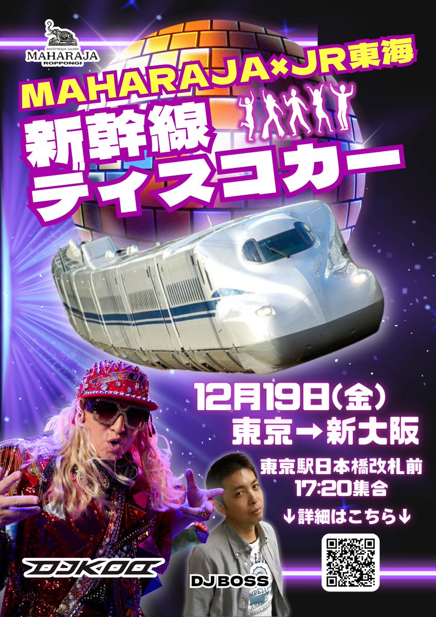 JR東海は、昭和100年を記念して「新幹線ディスコカー」を12月19日に運行する。過去、1988年に東海道新幹線で開催されたディスコイベントを再現し、DJ KOOやマハラジャ六本木のDJによる音楽、ディスコライトや“お立ち台”など、当時の雰囲気を新幹線の車内で楽しめる「ぶっ飛び特別企画」です!