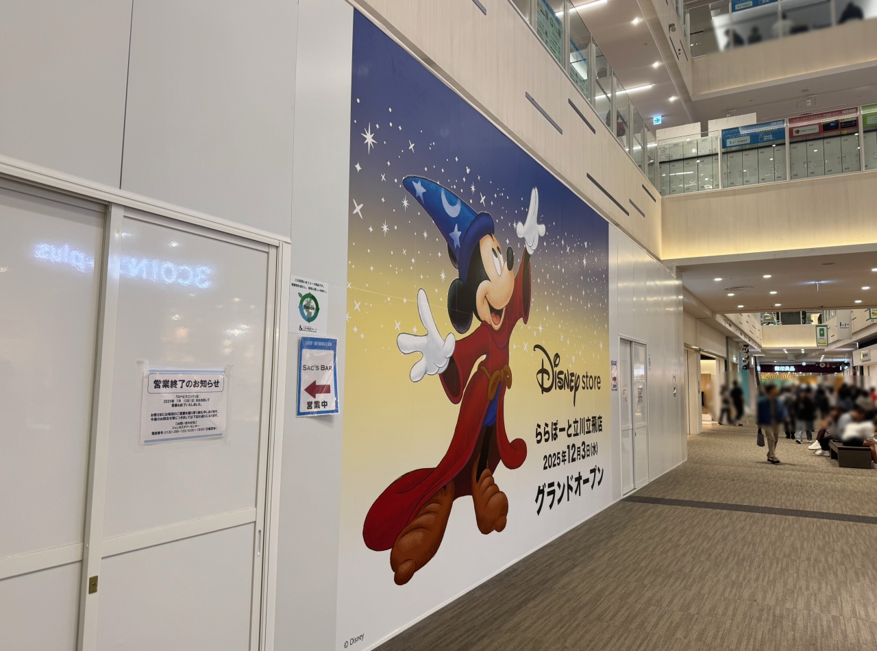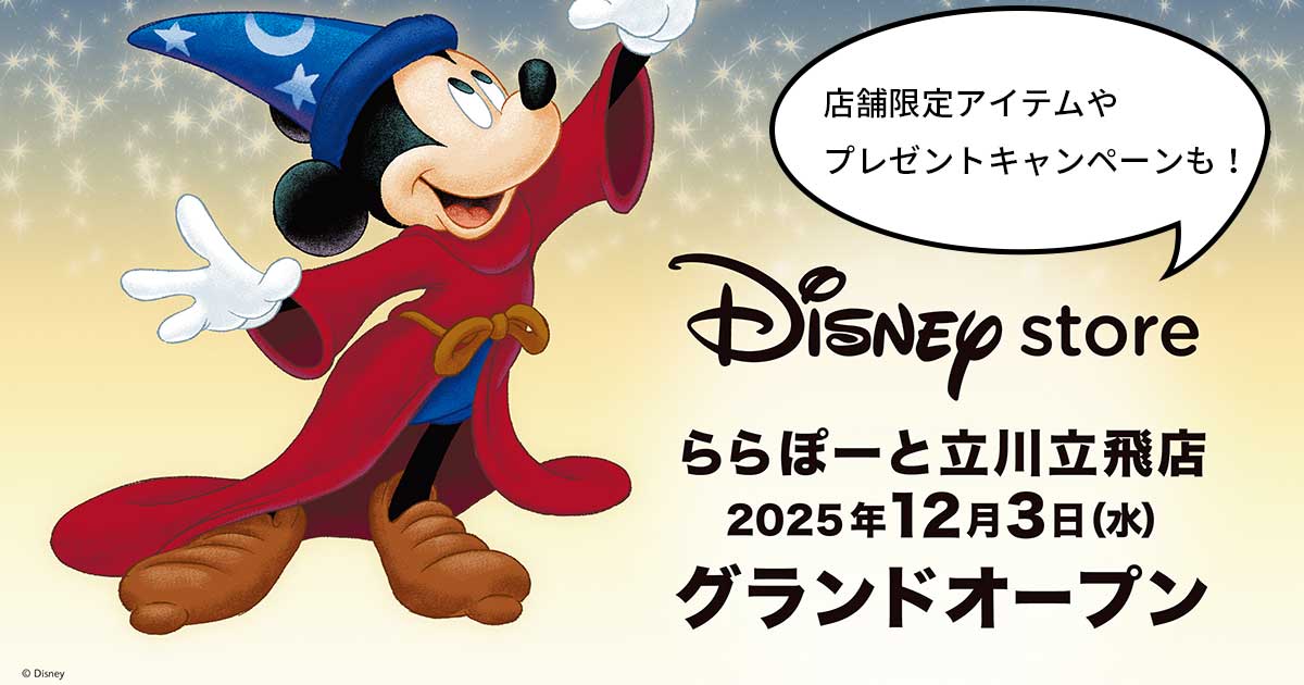 「ディズニーストア ららぽーと立川立飛店」が、2025年12月3日(水) にグランドオープンします。絵本のようなやさしいデザインの店内で、入口には「魔法使いの弟子」姿のミッキー像が登場。プーさんと撮影できるフォトスポットや、『シンデレラ』テーマのフィッティングルームも設置されます。