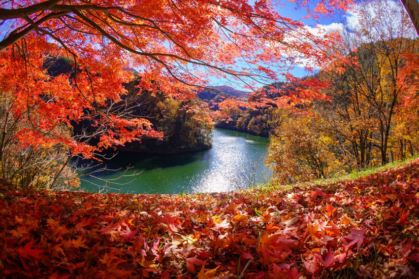 長野県・箕輪町の「もみじ湖(箕輪ダム湖)」では、約1万本のモミジが紅葉中だ。