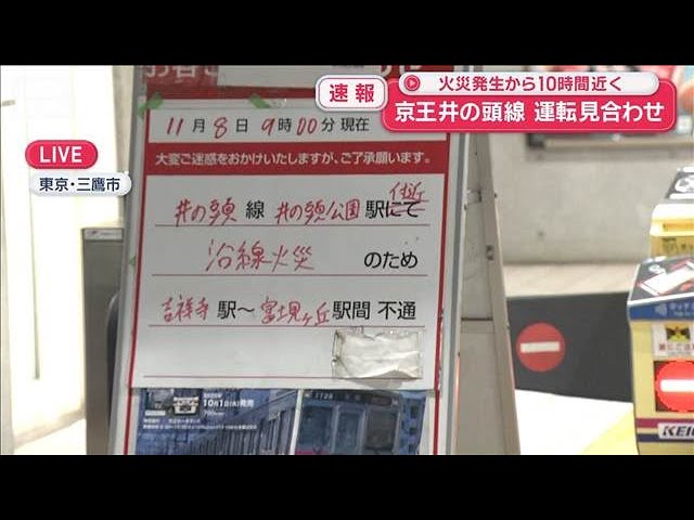東京・三鷹市の京王井の頭線で発生した線路内の火災の影響が、発生から約10時間たった現在も続いています。