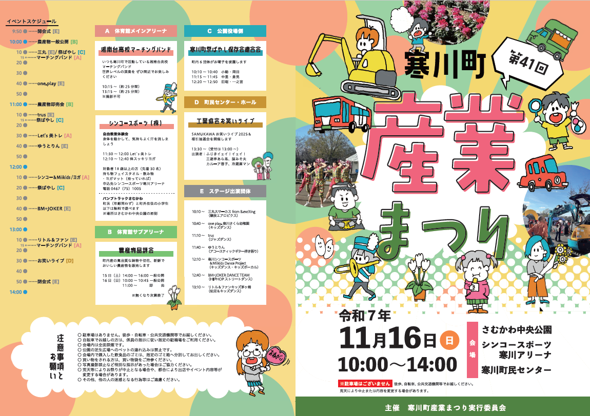 2025年11月16日(日)、神奈川県寒川町の「さむかわ中央公園」ほかで「寒川町産業まつり」が開催されます。工業・商業・農業の魅力を一度に楽しめるイベントで、最新技術の展示や重機乗車体験、地元グルメが味わえるキッチンカー、農産物の品評会・即売会が勢ぞろいしますよ!