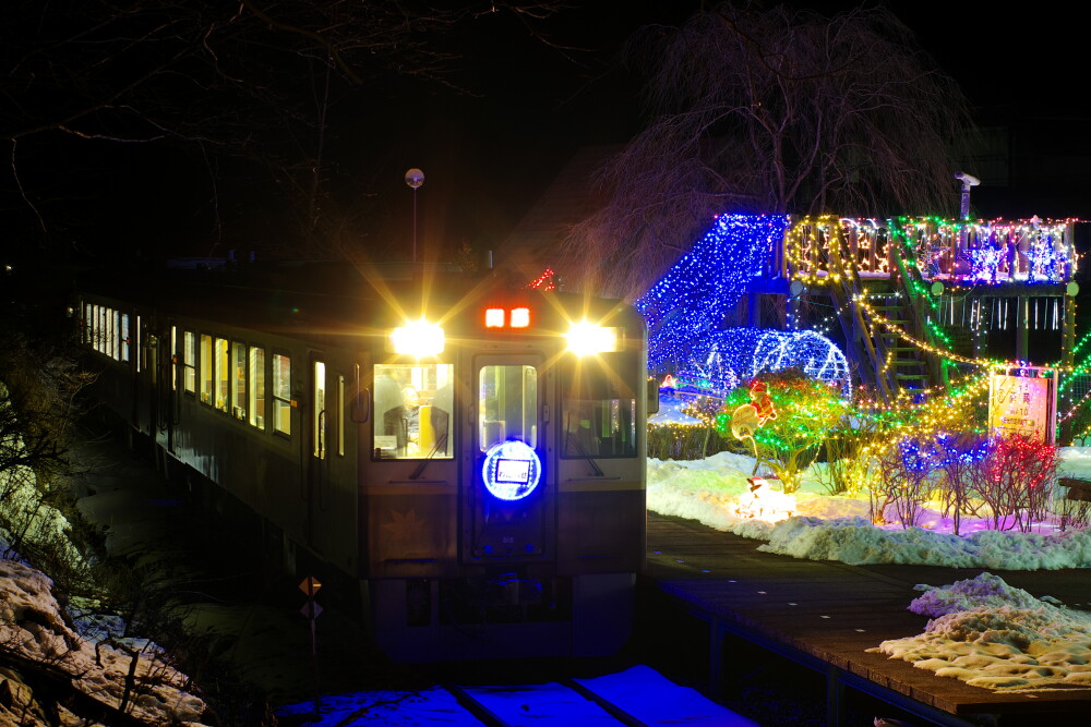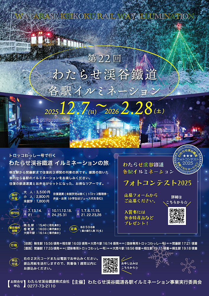 わたらせ渓谷鐵道では「第22回 各駅イルミネーション」にあわせ、2025年12月7日〜2026年2月28日まで、夕方〜夜の列車6本を「わたらせ渓谷イルミネーション号」として運転します。