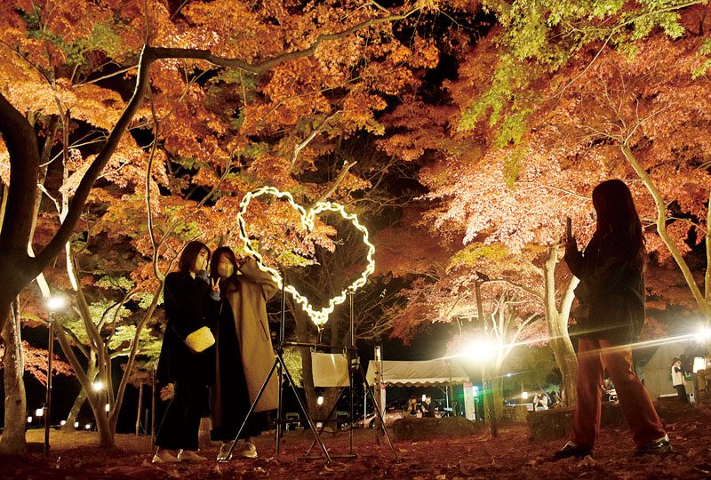 メイン会場の「月の石もみじ公園」では、約150球のLEDに加え、竹まり約120個、竹ランタン約50個などが園内を照らし、幻想的な紅葉が広がります。