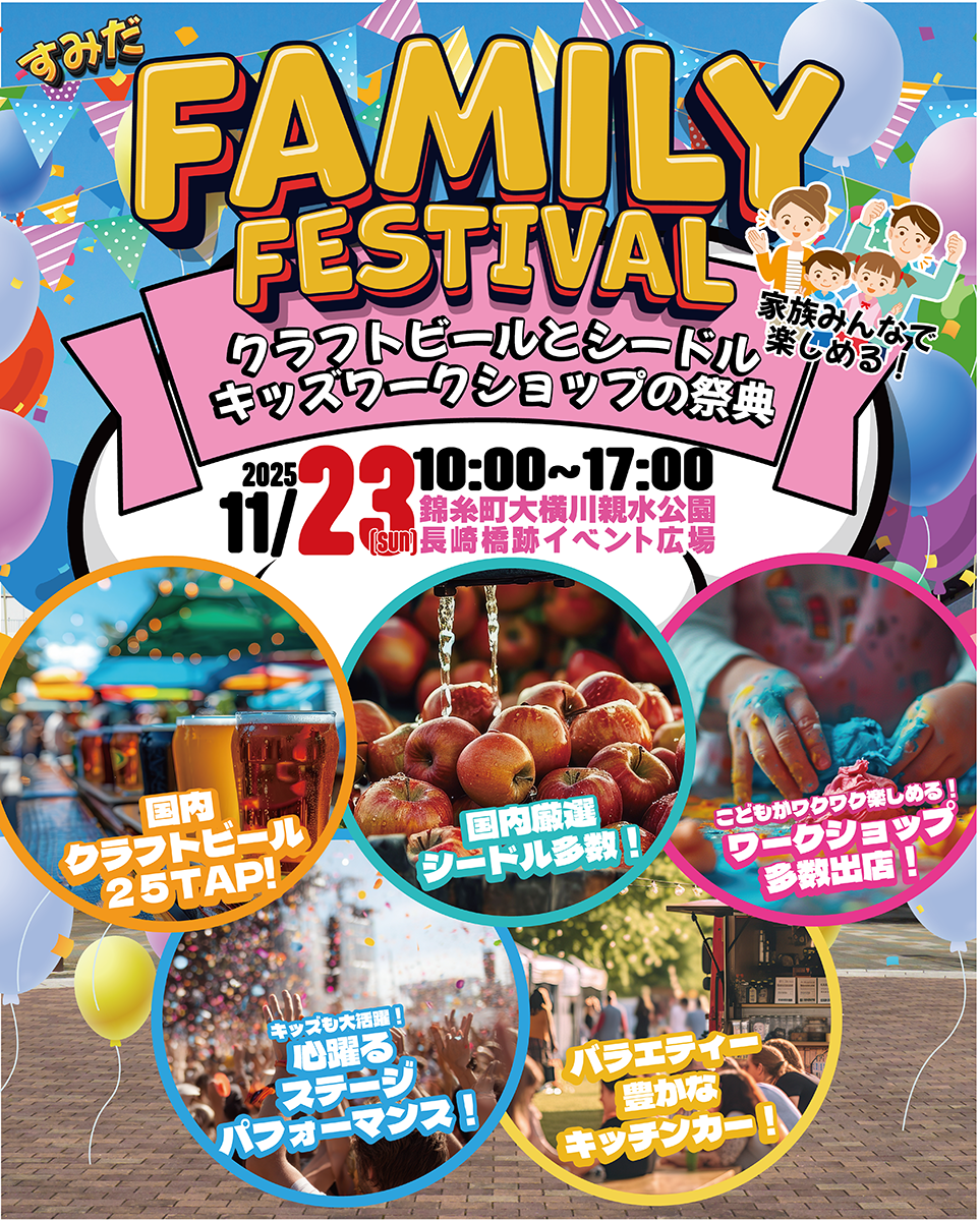 「すみだファミリーフェスティバル2025秋」が11月23日、錦糸町・大横川親水公園で開催される。子育て世代と大人が一緒に楽しむ場を目的としたイベントで、2回目となる今回は内容を更に拡充して実施する。