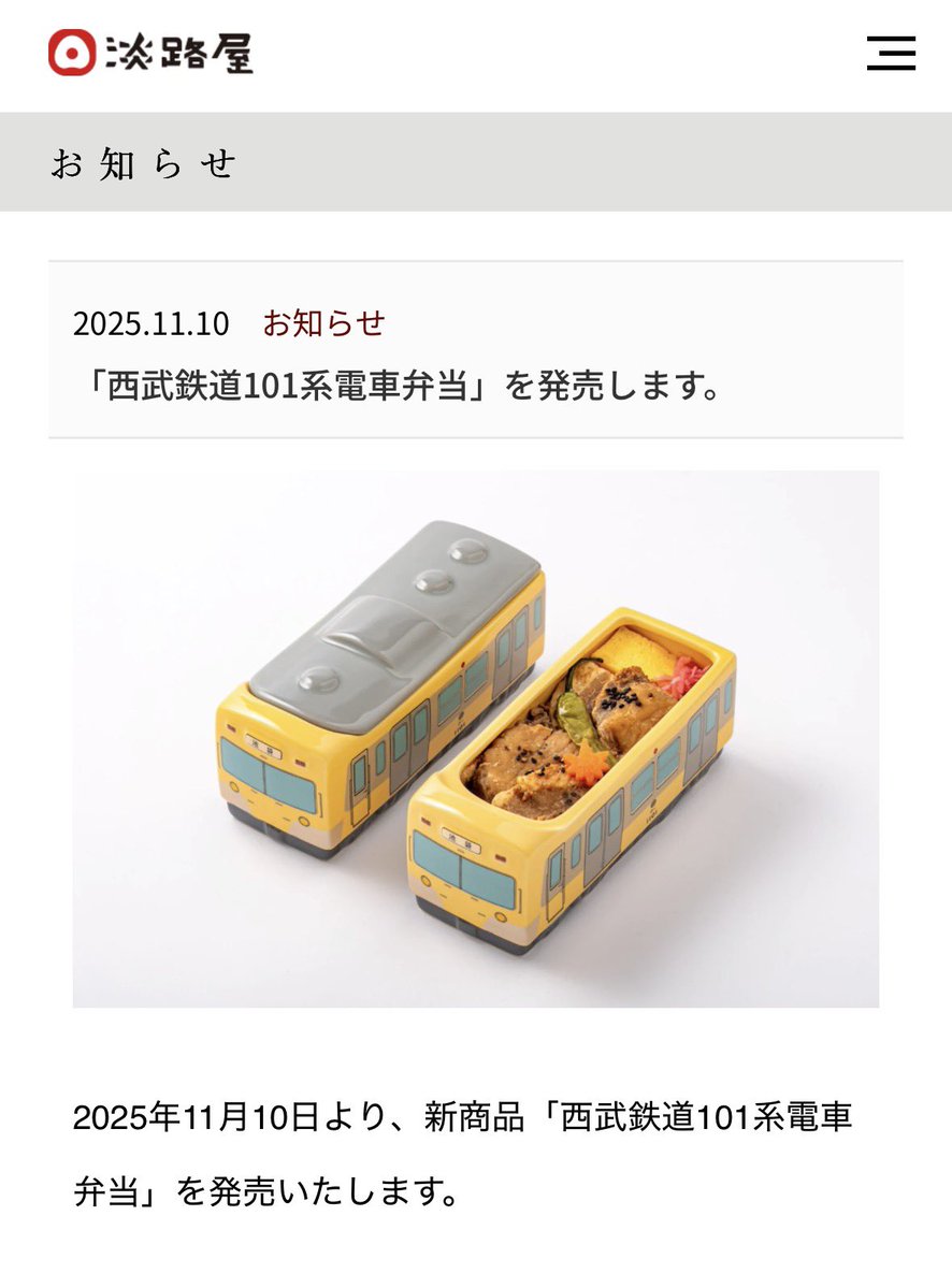 「なんとお弁当に‼」〝黄色い車両〟西武鉄道101系電車が〝豚みそ丼〟に「 幼い思い出の車両」「ちょっとお値段が」 …▼「見た目も中身も、本気です」 「黄色い車両」として親しまれた「西武鉄道101系電車」がお弁当になり、鉄道ファンのみならず大きな話題になっている。 … (出典:西スポWEB OTTO!) |