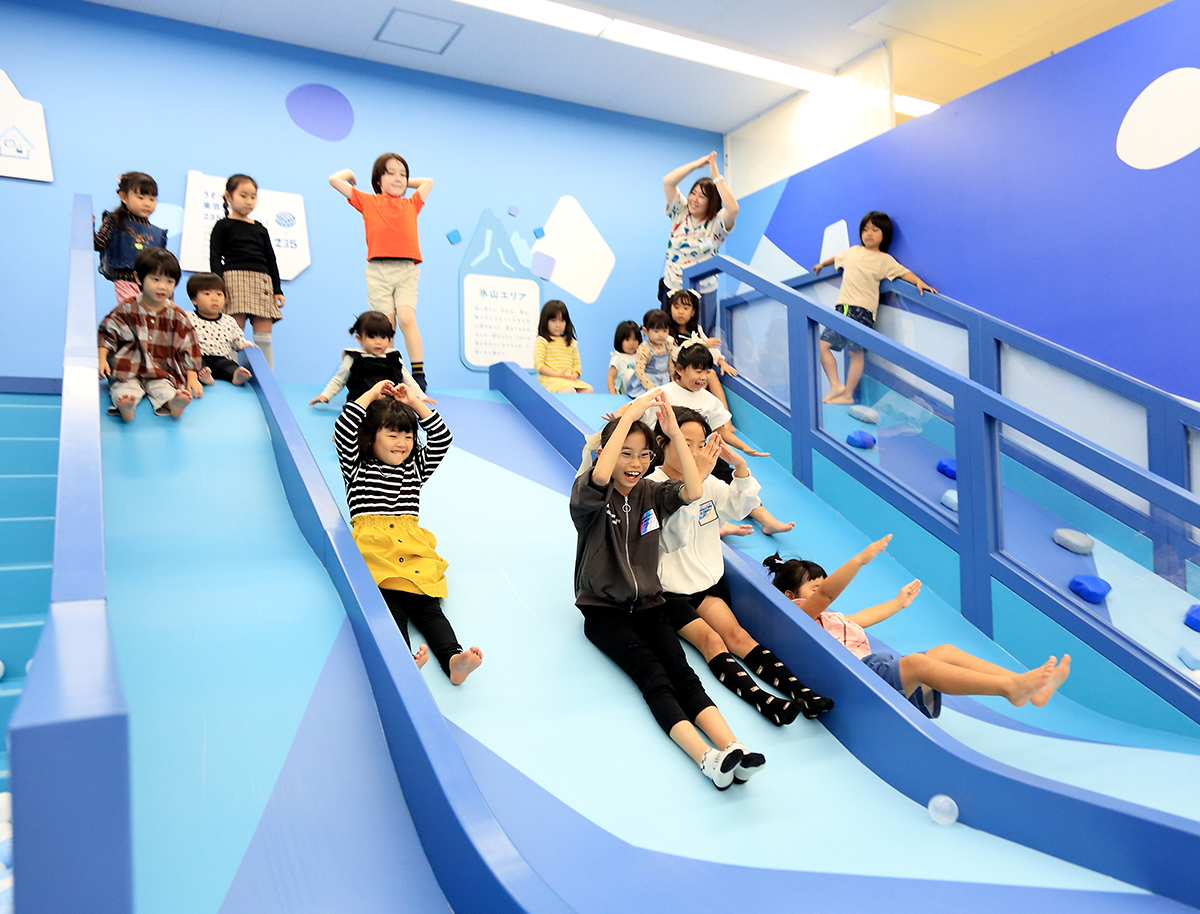 「ちきゅうのにわ」は0〜12歳の子どもと家族が対象の、地球や自然をテーマにした、今話題の屋内型プレイグラウンド。氷山の滑り台、火山のボール遊び、地層や砂に触れられる砂場、SDGsや自然について学べるワークショップなど、遊びながら学べる仕掛けが充実しています。