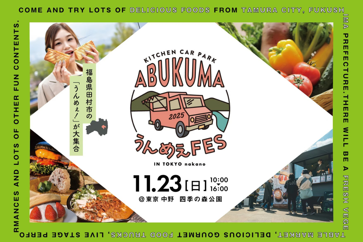 福島県田村市の特産品やグルメが集まる「KITCHENCAR PARK-ABUKUMA うんめぇFES」が、11月23日に東京・中野区の「中野四季の森公園」で開催される。