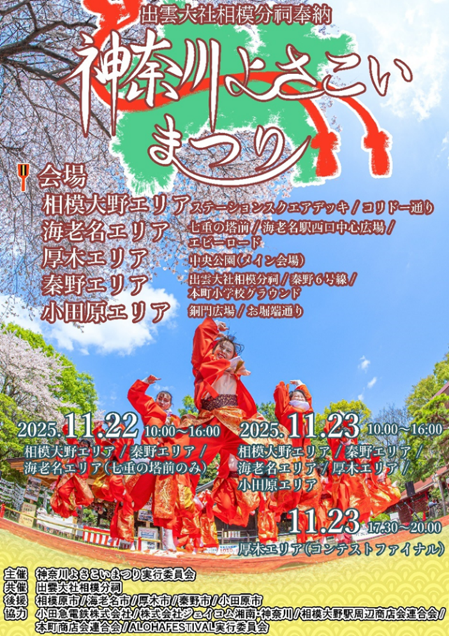小田急線沿線の5市(海老名・厚木・秦野・小田原・相模原)11会場で、11月22日(土)・23日(日)に「第1回神奈川よさこいまつり」が開催される。