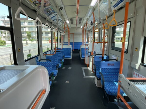 「エルガEV」は屋根上に高電圧バッテリーを搭載するため車高が高く、CO₂排出ゼロ・車内フルフラット化・回生ブレーキ搭載が特徴。後部にはボックス席風の向かい合わせ座席も設置されている。