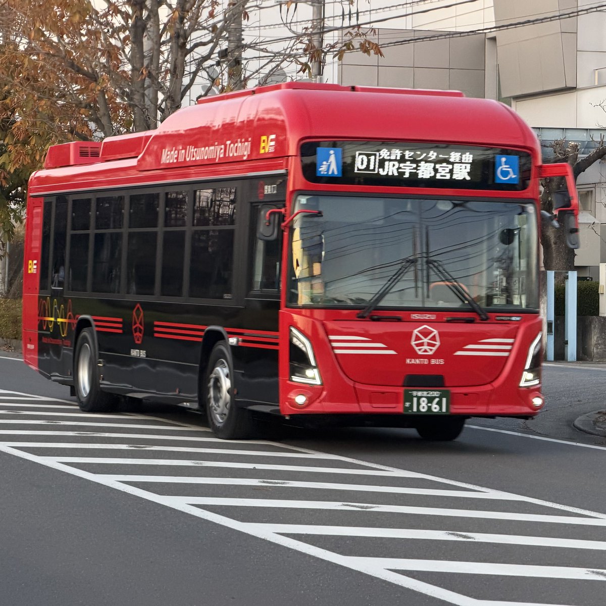 製造は宇都宮のジェイ・バス工場で、車体には「Made in Utsunomiya Tochigi」と記され地産地消のEVバスをアピール。デザインは川西康之氏が担当し、赤と黒を基調に、伝統の三筋ラインを配した目立つ外観となっている。