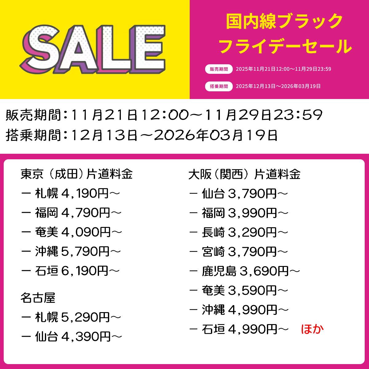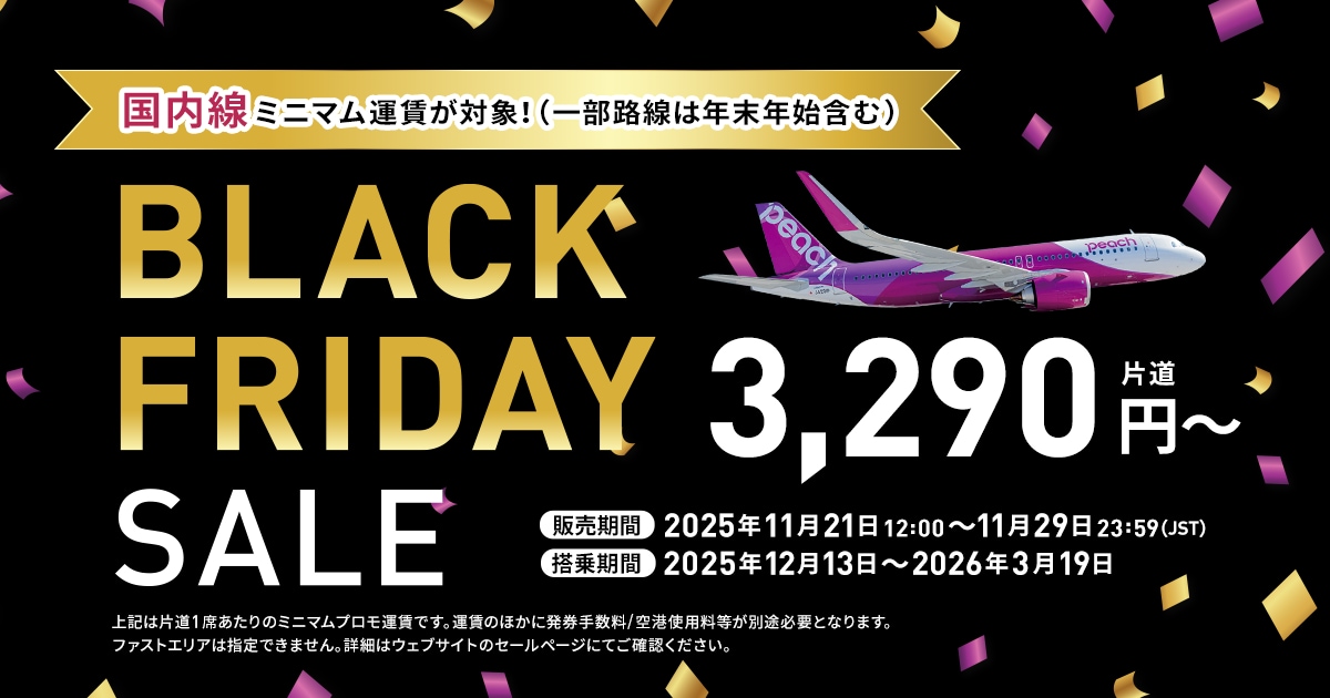 ピーチ・アビエーションは、11月21日正午~29日に「国内線ブラックフライデーセール」を実施します。